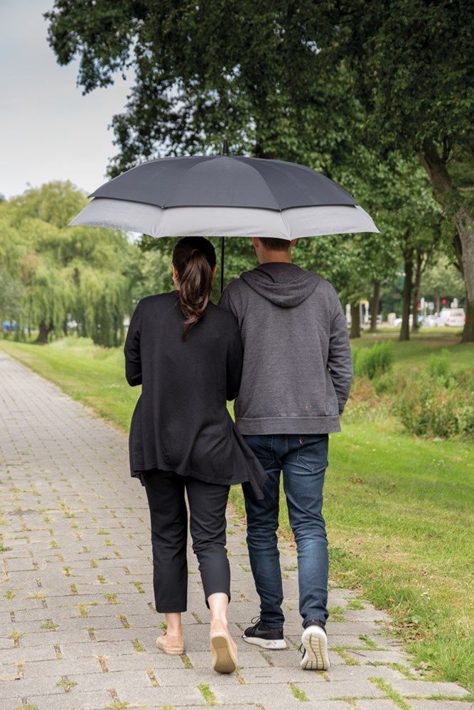 Geschlossen ist dieser Sturm-Regenschirm so leicht und klein wie ein 23'' Regenschirm. Im geöffnetem Zustand erweitert sich dieser zu einem 27'' Sturm-Regenschirm. Dies bietet Ihnen mehr Schutz und er ist groß genug für 2 Personen. Automatisches Verschluss- und Öffnungssystem mit 190T Pongee Polyester, Metallschaft, Fiberglassrahmen, Kunststofftips und matt schwarzer Griff.