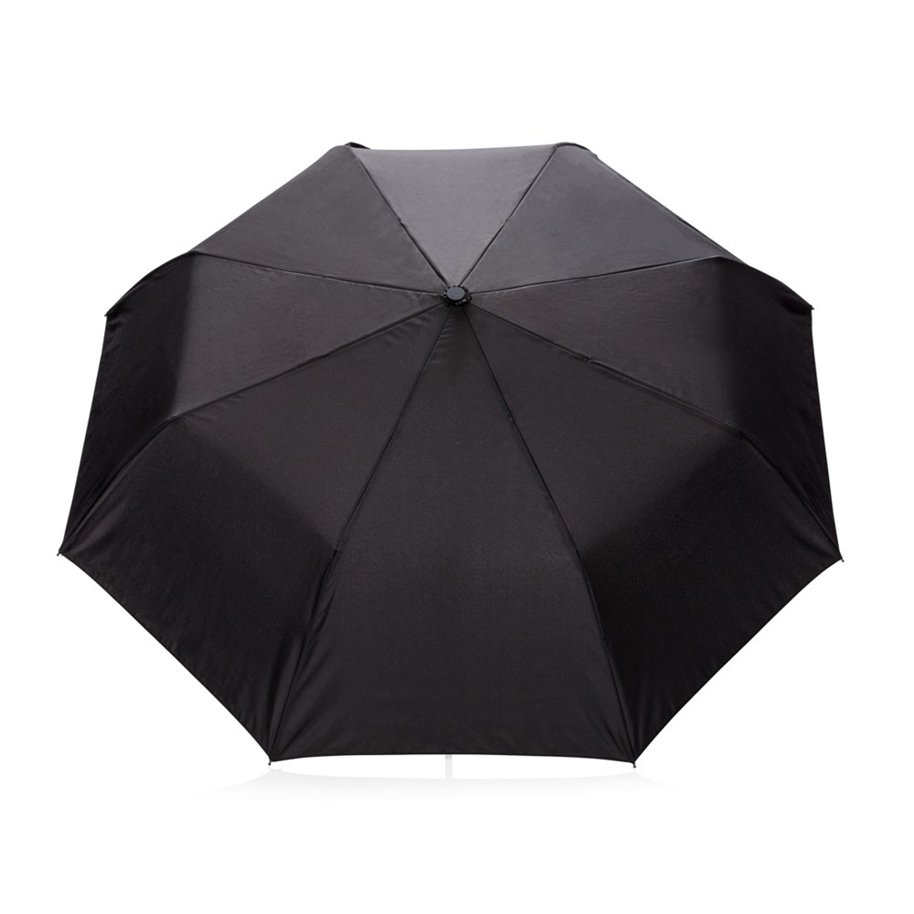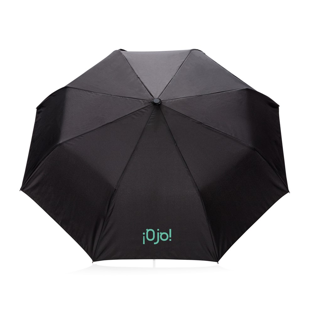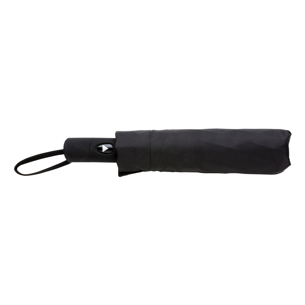 Dieser 21" faltbare Schirm mit Automatiköffnung aus 190T Pongee hat einen schwarzen Rahmen mit Fiberglass Gestänge. Der Griff hat die gleiche Farbe wie das Etui.