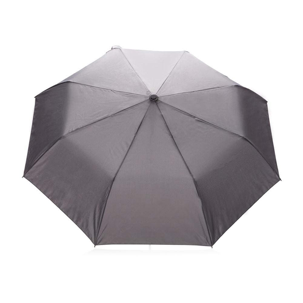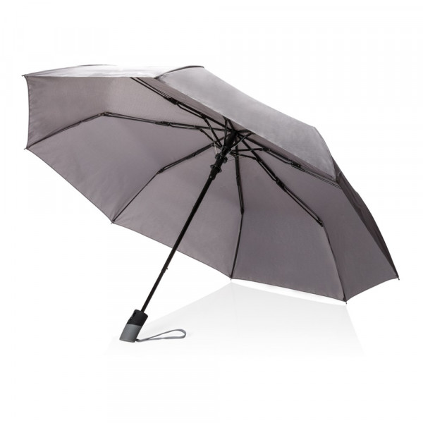 Dieser 21" faltbare Schirm mit Automatiköffnung aus 190T Pongee hat einen schwarzen Rahmen mit Fiberglass Gestänge. Der Griff hat die gleiche Farbe wie das Etui.