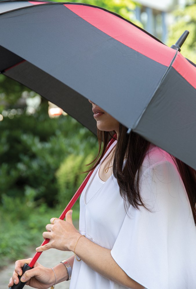 Elegant geschützt bei jedem Wetter. Der große Schirm mit Wind-Proof-System, aus 190T Pongee Polyester, mit extrem stabilem Fiberglasrahmen und farblich passendem Griff hält Sie auch bei stürmigen Bedingungen im Trockenen.