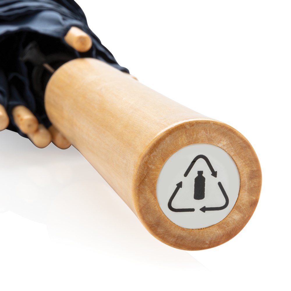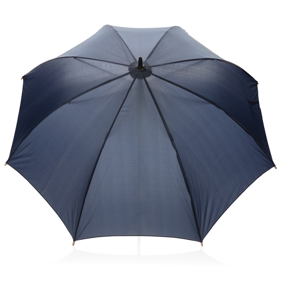 Ein Schirm für alle Fälle. Hergestellt aus 190T Pongee RPET Polyester mit Metallrahmen und Fiberglasspeichen bietet er dem Wind kraftvollen Wiederstand und sieht zudem auch noch wirklich schick aus.