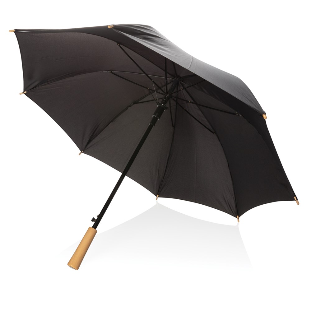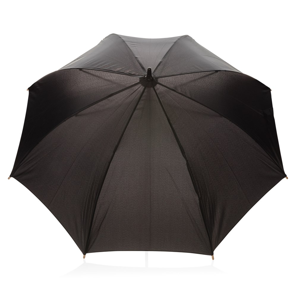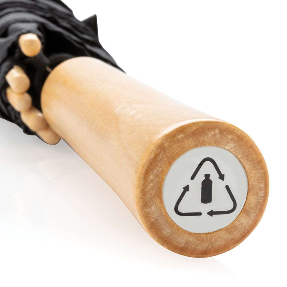 Ein Schirm für alle Fälle. Hergestellt aus 190T Pongee RPET Polyester mit Metallrahmen und Fiberglasspeichen bietet er dem Wind kraftvollen Wiederstand und sieht zudem auch noch wirklich schick aus.