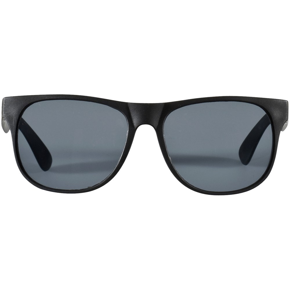 Sonnenbrille im Retro Design mit schwarzen Gläsern der Kategorie 3 und farbigen Bügeln. EN ISO 12312-1 und UV 400 konform.