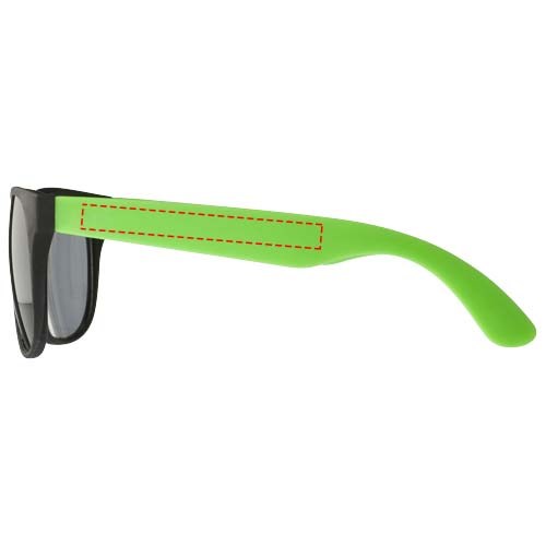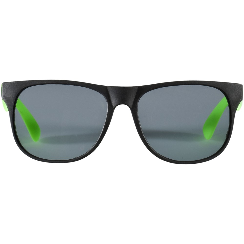 Sonnenbrille im Retro Design mit schwarzen Gläsern der Kategorie 3 und farbigen Bügeln. EN ISO 12312-1 und UV 400 konform.