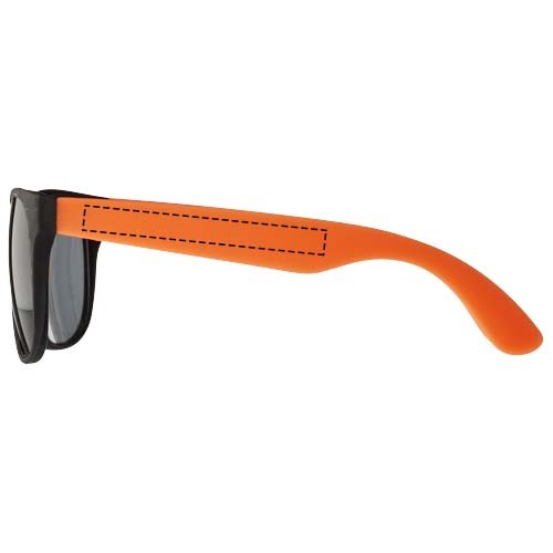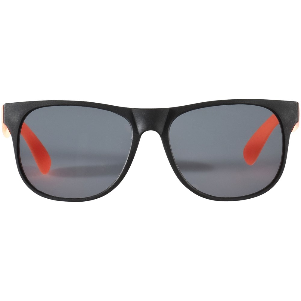 Sonnenbrille im Retro Design mit schwarzen Gläsern der Kategorie 3 und farbigen Bügeln. EN ISO 12312-1 und UV 400 konform.