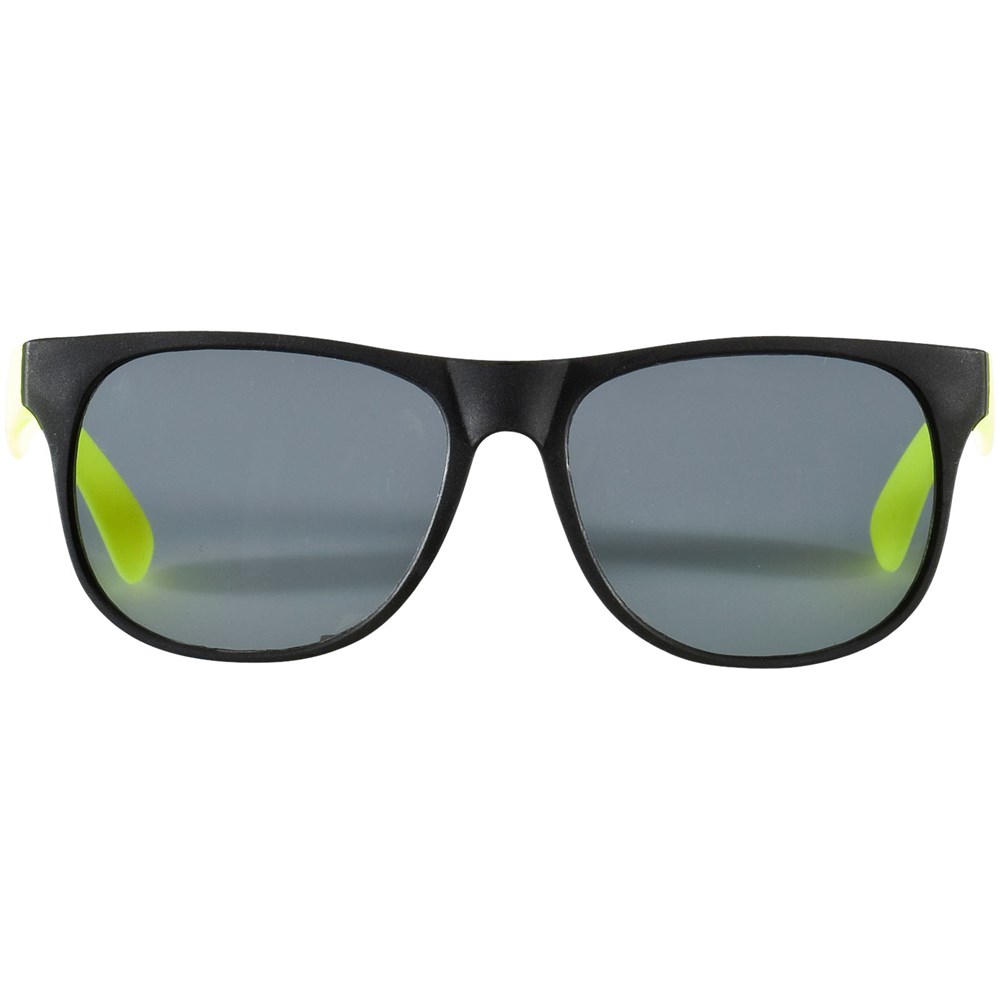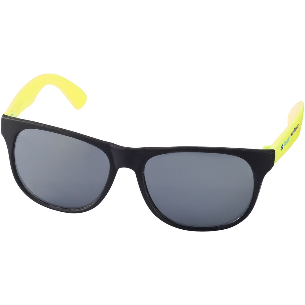 Sonnenbrille im Retro Design mit schwarzen Gläsern der Kategorie 3 und farbigen Bügeln. EN ISO 12312-1 und UV 400 konform.