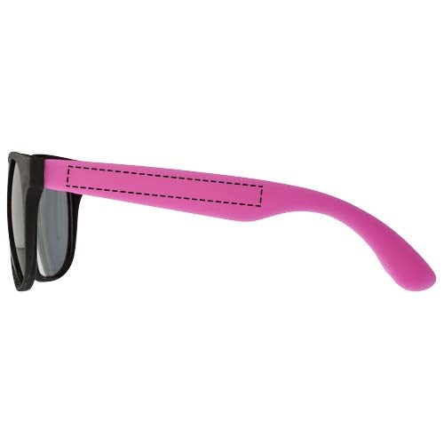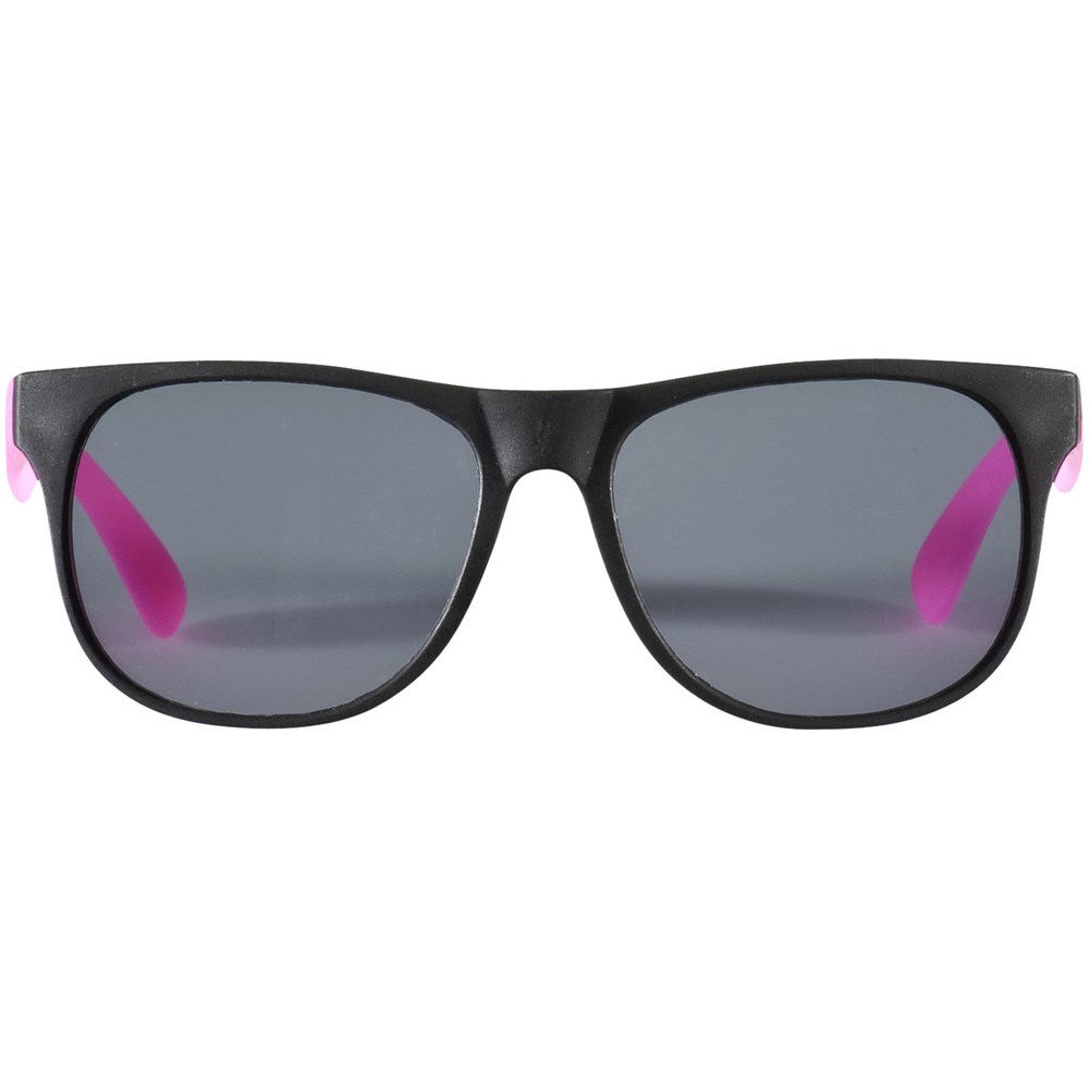 Sonnenbrille im Retro Design mit schwarzen Gläsern der Kategorie 3 und farbigen Bügeln. EN ISO 12312-1 und UV 400 konform.