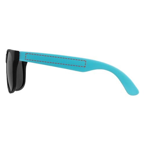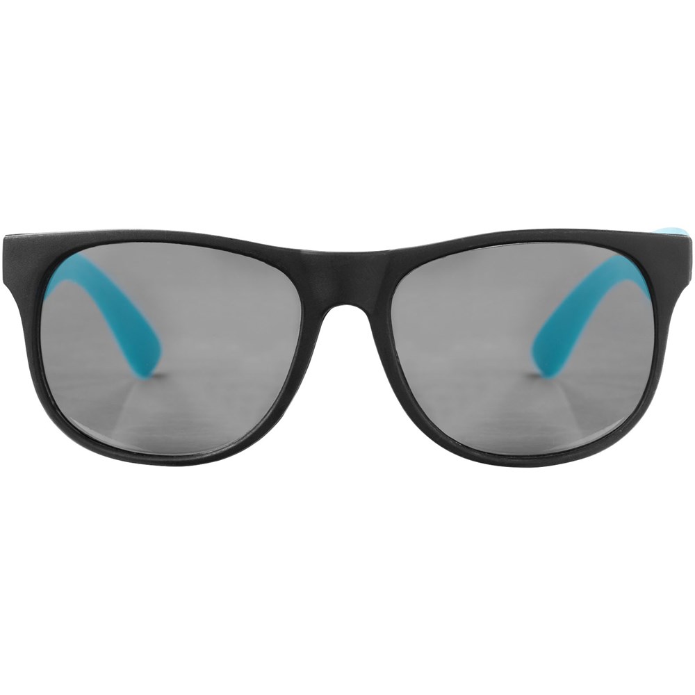 Sonnenbrille im Retro Design mit schwarzen Gläsern der Kategorie 3 und farbigen Bügeln. EN ISO 12312-1 und UV 400 konform.