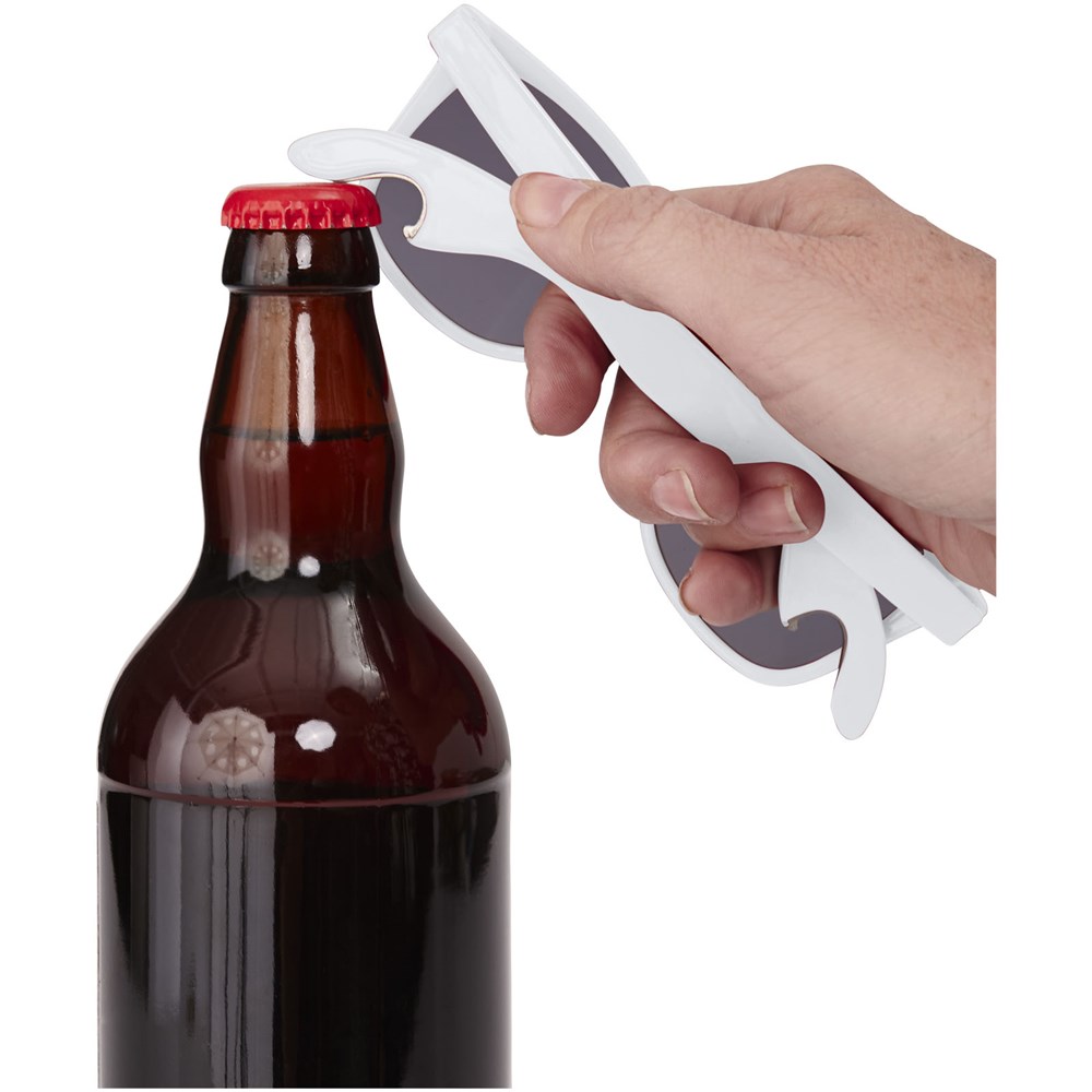 Sonnenbrille im Retro Design mit Kategorie 3 Linsen. Inkl. einem Metall Flaschenöffner am Ende des Bügels. Erfüllt EN ISO 12312-1 und UV 400.