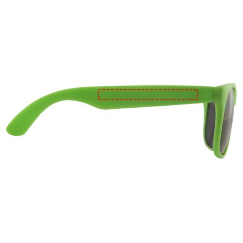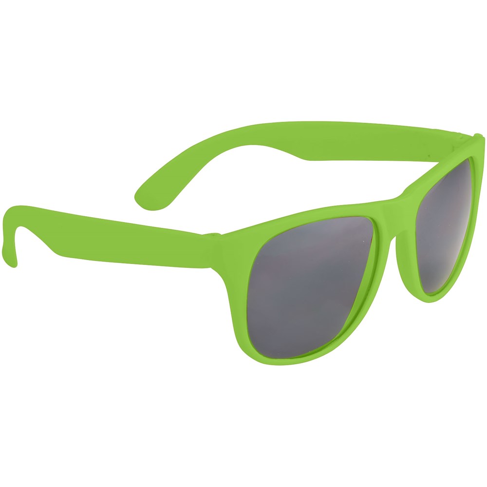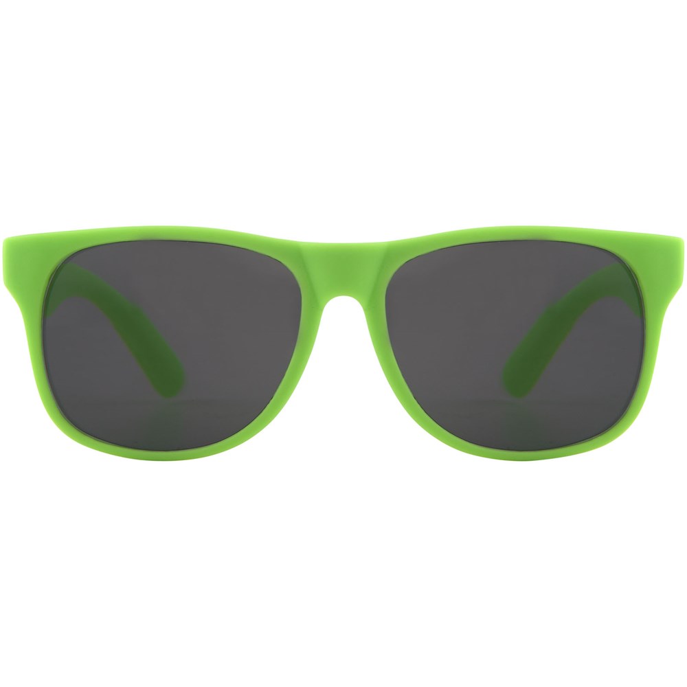 Sonnenbrille im Retro Design mit farbigem Gestell und schwarzen Gläsern der Kategorie 3. EN ISO 12312-1 und UV 400 konform.