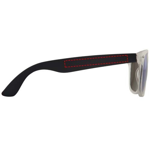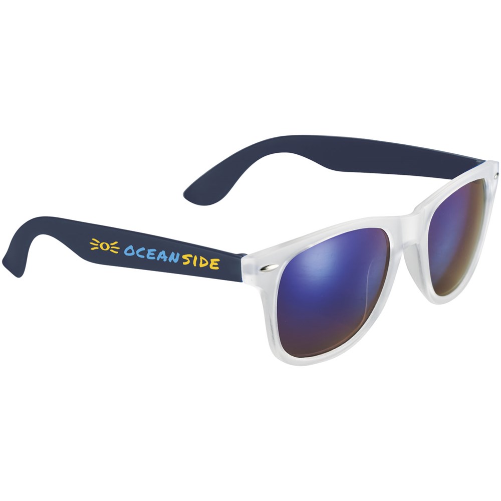 Sonnenbrille mit milchig weißem Rahmen, Kategorie 3 verspiegelte Gläser in 3 Farben und  farblich passender Bügel. EN ISO 12312-1 und UV400 konform.