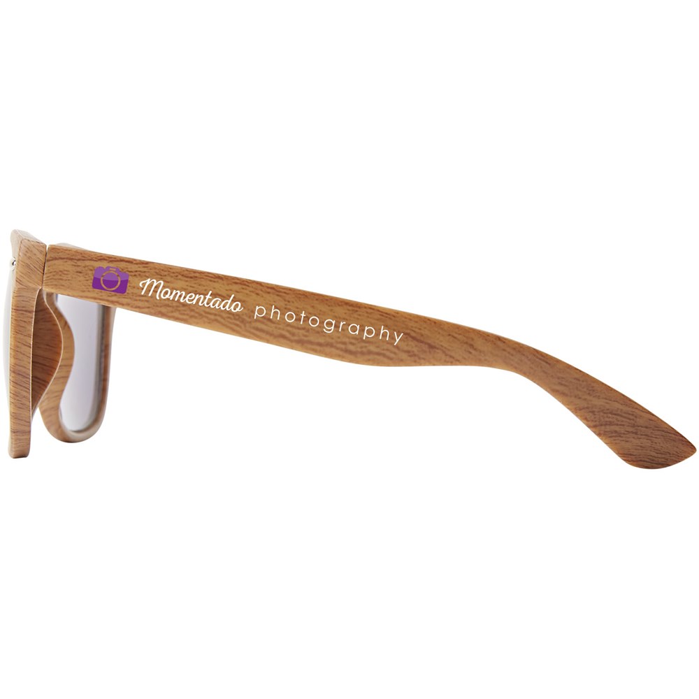 Sonnenbrille im Retro-Design mit holzartiger Oberfläche mit Gläsern der Kategorie 3. Erfüllt EN ISO 12312-1 und UV 400.