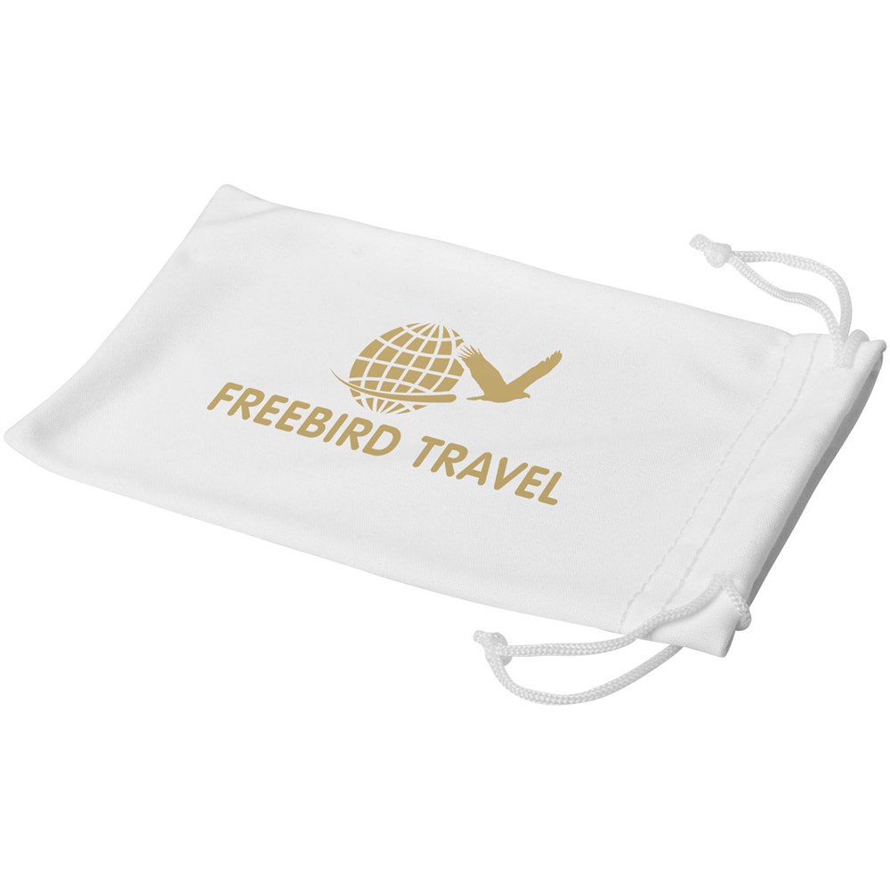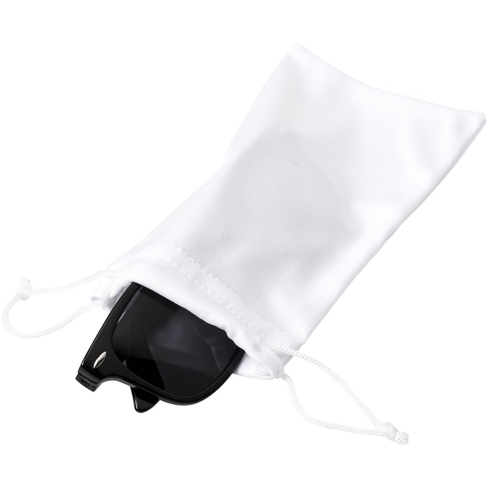 Mikrofaserbeutel mit Kordelzugverschluss zum sicheren Aufbewahren, Tragen und Reinigen Ihrer Sonnenbrille. Die große Farbauswahl und die große Dekorationsfläche machen es zu einem perfekten Geschenk zur Ergänzung Ihrer Sonnenbrille.
