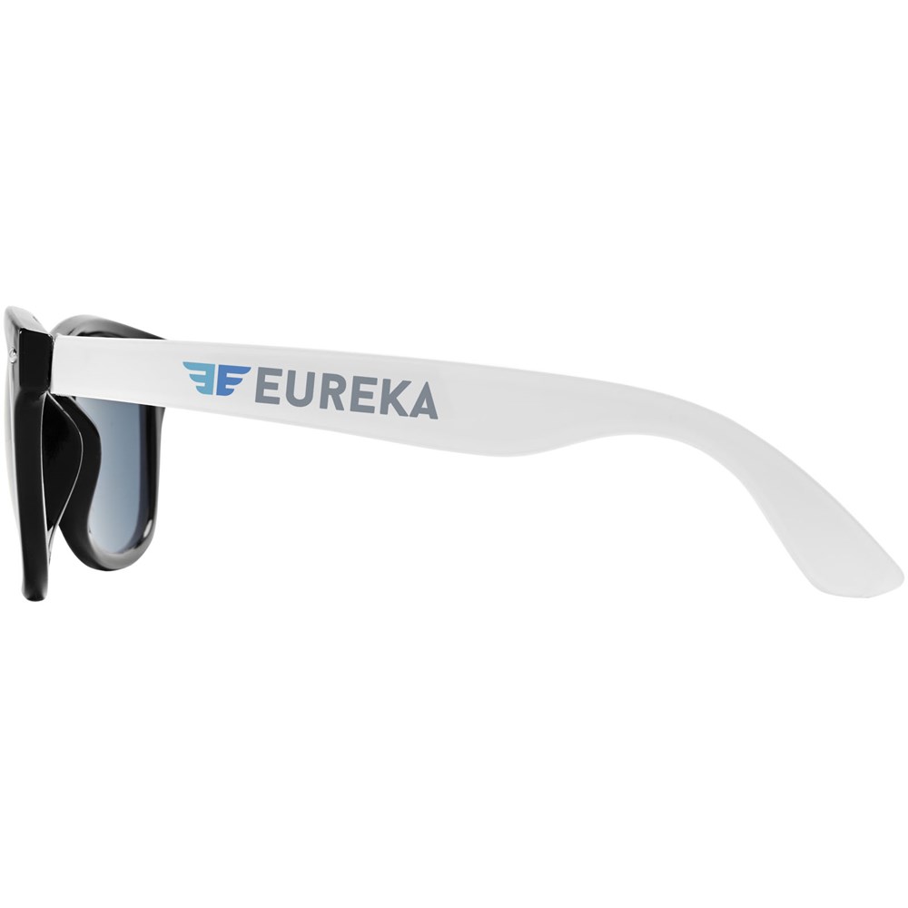 Sun Ray Sonnenbrille im Retro Design mit weißen Bügeln für viele Veredelungsmöglichkeiten. Erfüllt EN ISO 12312-1 und UV 400; die Gläser sind in Kategorie 3 eingestuft.