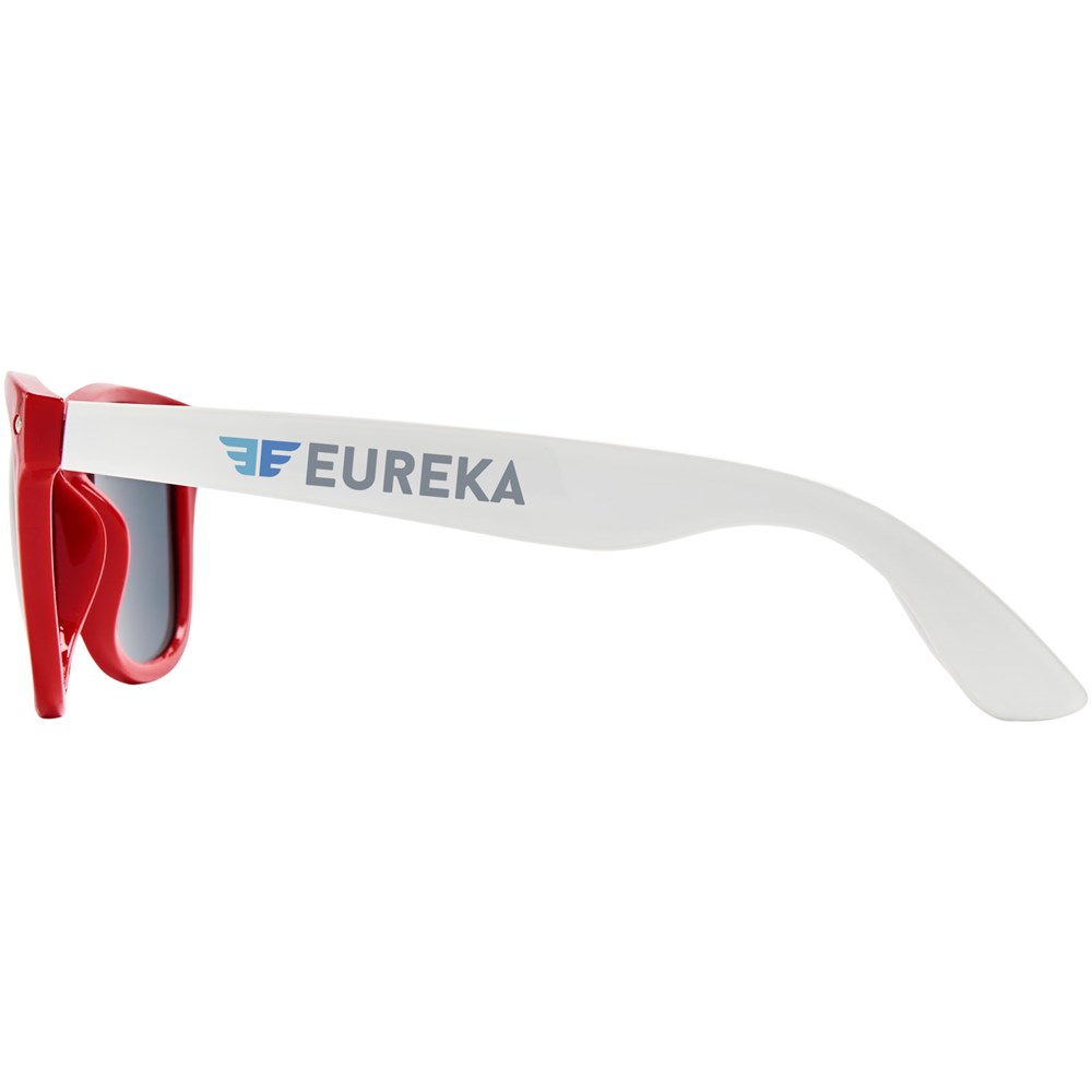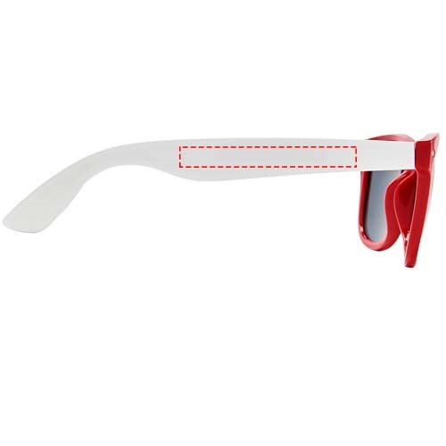 Sun Ray Sonnenbrille im Retro Design mit weißen Bügeln für viele Veredelungsmöglichkeiten. Erfüllt EN ISO 12312-1 und UV 400; die Gläser sind in Kategorie 3 eingestuft.