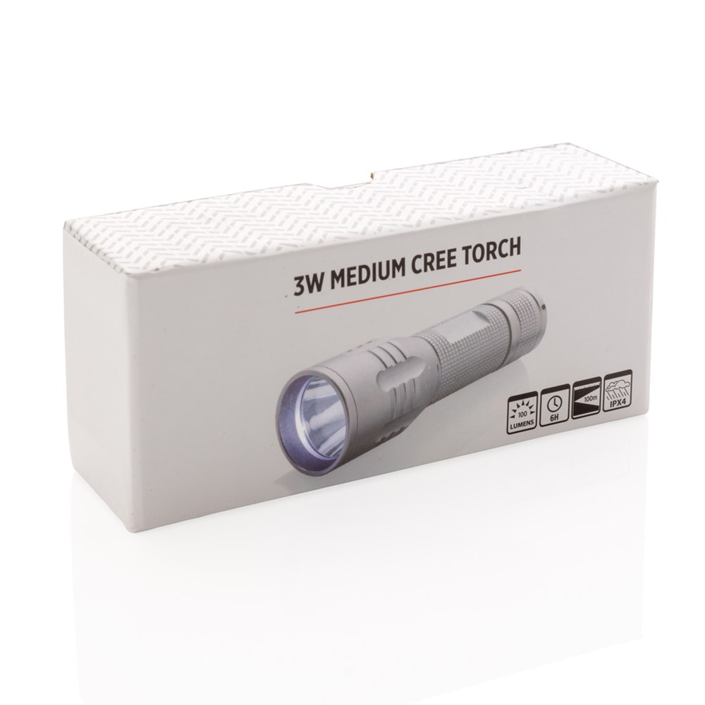 Diese langlebige Aluminium Taschenlampe verfügt über spezielle CREE LED´s welche extra helles Licht ausstrahlen. Die CREE Technologie überschreitet mit Ihren 100 Lumen deutlich die Helligkeit normaler LED´s und kann bis zu 15h genutzt werden. Inklusive Batterien für den sofortigen Gebrauch.