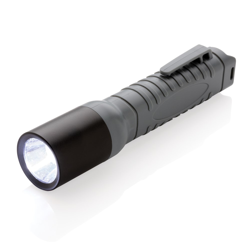 Diese 3W Taschenlampe aus ABS ist ein wahres Leichtgewicht und ist somit perfekt für unterwegs. Der Kopf aus Aluminium und am hinteren Ende ein Clip zur Befestigung an Ihrem Gürtel. 180 Lumen und inklusive Batterien um sie sofort für bis zu 2h zu benutzen. Leuchtweite bis zu 200m. IPX 44 wasserfest.