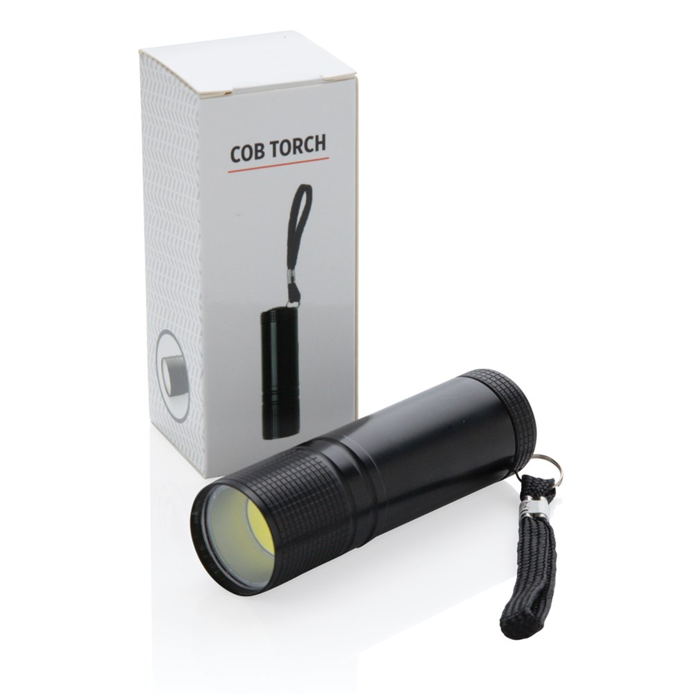 Superhelle COB-Leuchte im Taschenformat. COB ist heller ist das althergebrachte LED und benötigt dabei noch weniger Energie - kann somit bis zu 30% länger leuchten. Aluminiumgehäuse mit Trageriemen. Inkl. 3xAAA-Batterien