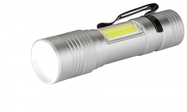 Geballte Leuchtkraft im Hosentaschenformat bietet diese kleine Taschenleuchte. Moderner Look gepaart mit viel Funktionalität. COB und XPE Technologie mit vier Leuchtmodi und Clip. Licht vorne: XPE LED Licht seitlich COB LED 4 durchschaltbare Modi: XPE hell / XPE halbe Leuchtstärke / COB hell / COB blinkend Inklusive Batterie: 1 x AA Material: Aluminium Farbe: Silber Einzelverpackung Maße: 97 x ⌀ 23 mm Gewicht: 64 g Werbeanbringung: Auf dem Schaft 20 x 8 mm (D2/L2) 3D-Gravur, max. 18 mm Breite (L3) Kompakt, praktisch und 100% klimaneutral.