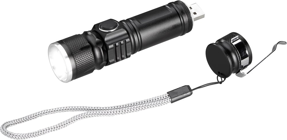 Leuchtstark und gut für die Umwelt. Kompakte Taschenleuchte mit drei Lichtmodi und Zoom-Funktion. Passt in jede Tasche; mit Clip und Trageschlaufe.