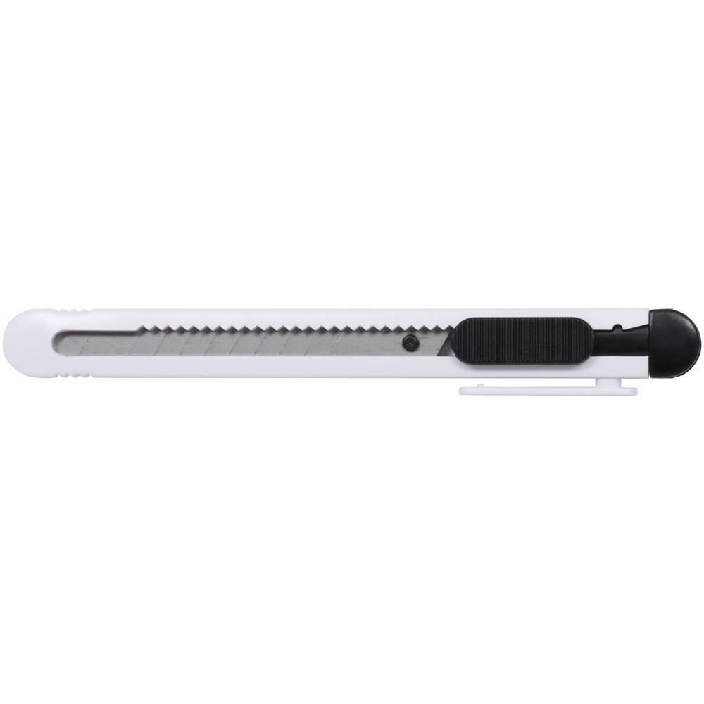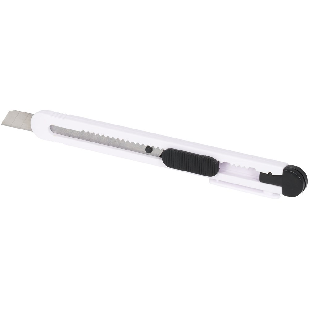 Universalmesser mit einziehbarer und austauschbarer Klinge (80 x 9 mm) mit 12 Segmenten. Integriertes Klingenabbrechwerkzeug und Taschenclip.