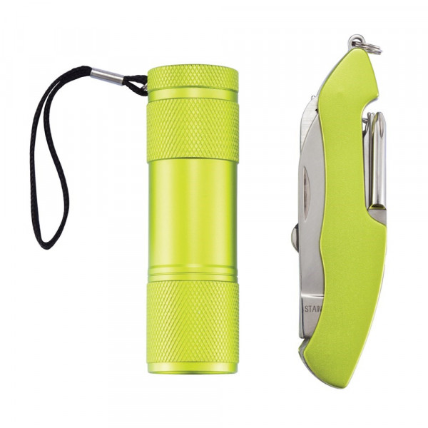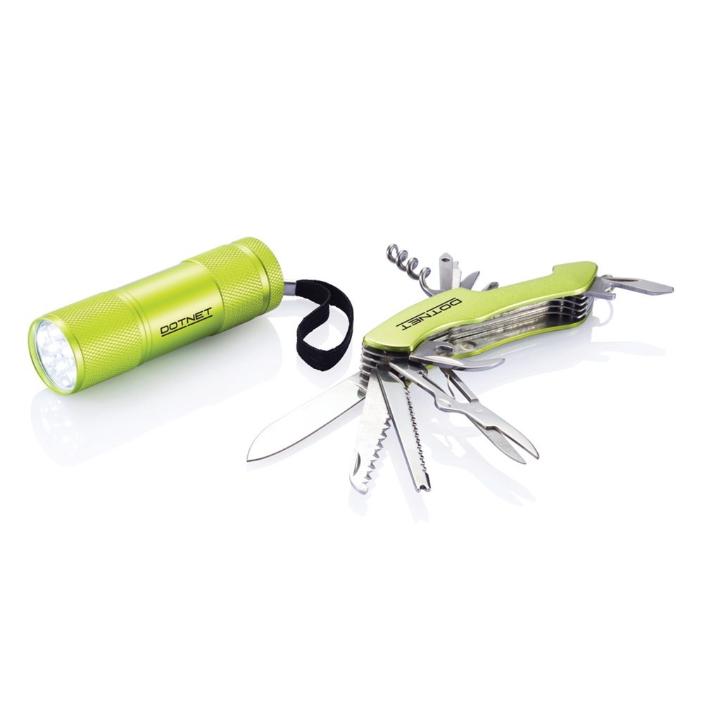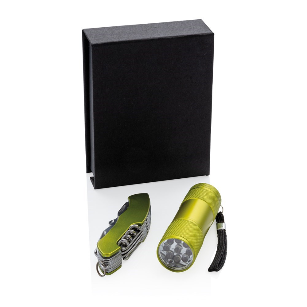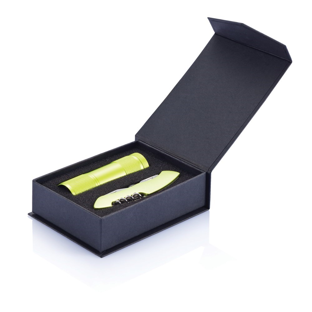 Set inkl. Taschenmesser aus eloxiertem Aluminium, 13 Funktionen, Quattro Taschenlampe aus eloxiertem Aluminium mit 9 LED, konfektioniert in Geschenkbox mit Magnetverschluss. Inklusive Batterien.