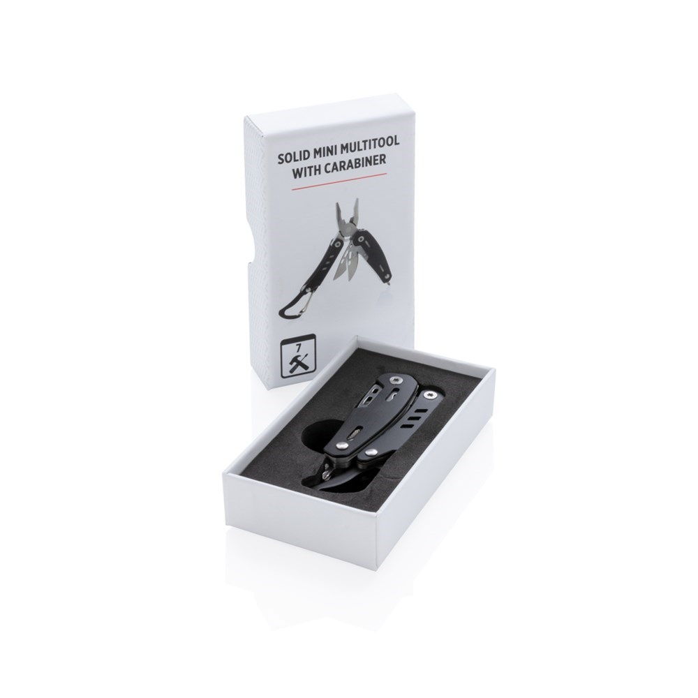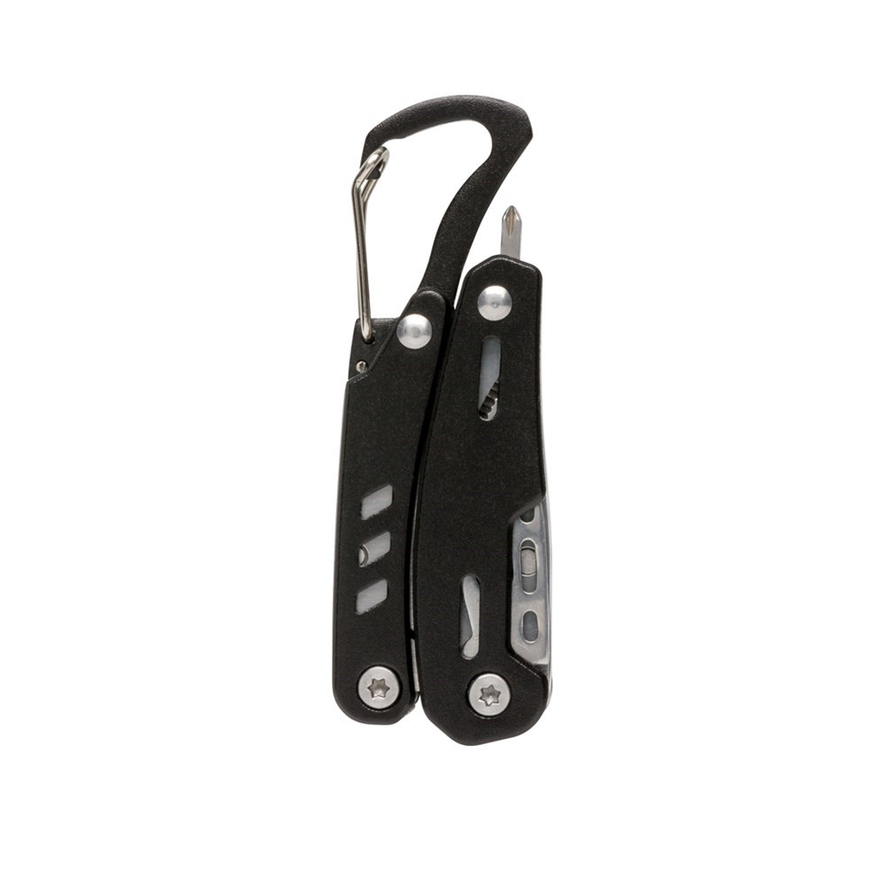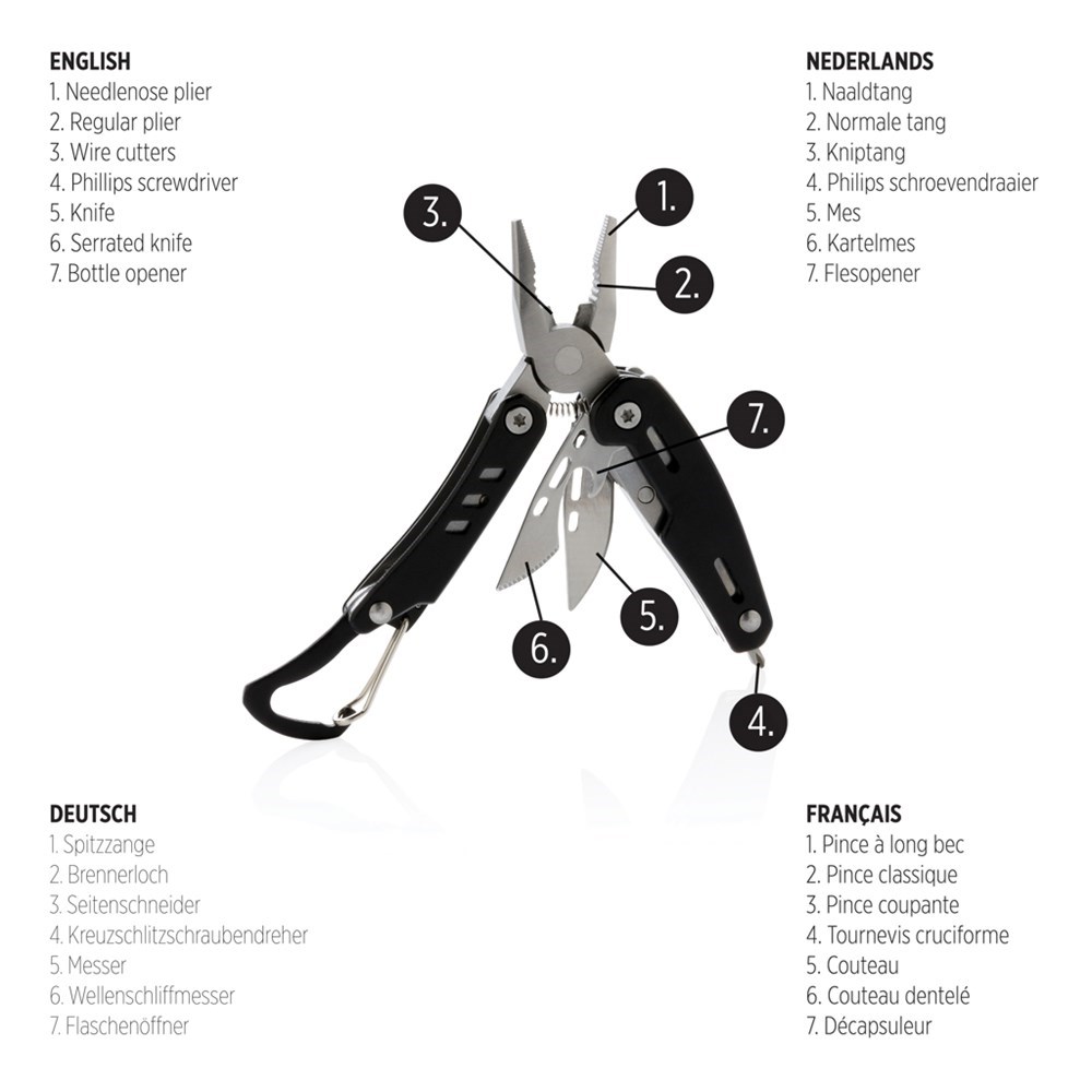Kompaktes Multitool im Aluminium-Case mit 7 Funktionen aus Stainless Steel wie z.B. eine Zange, Messer, Schraubendreher, Säge, Dosenöffner und vielem mehr. In Geschenkbox verpackt.