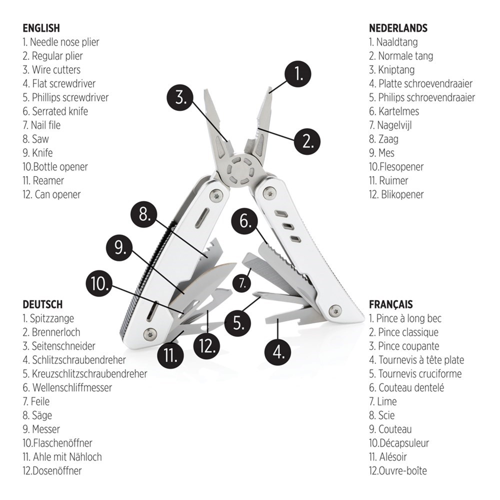 Multitool im Aluminium-Case mit 12 Funktionen aus Stainless Steel wie eine Feile, Zange, Messer, Schraubendreher, Säge, Dosenöffner und vielem mehr. In Geschenkbox verpackt.