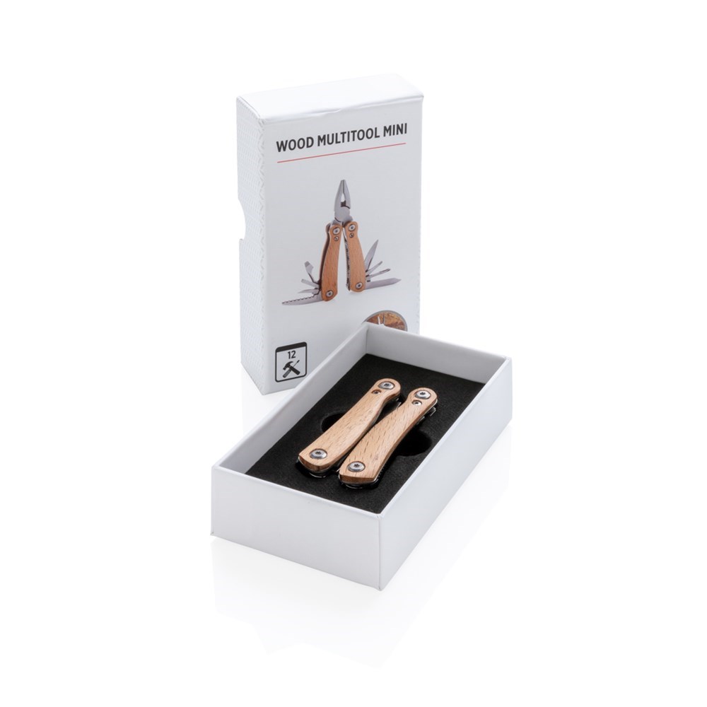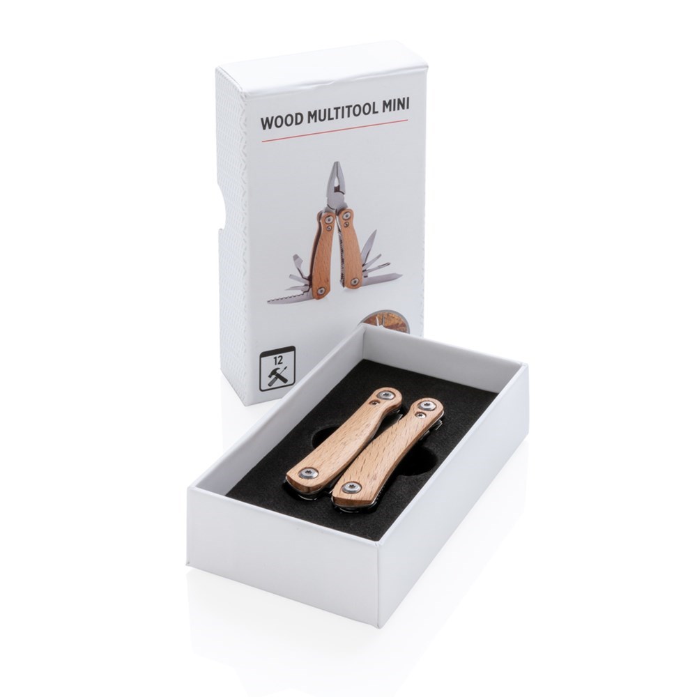 Multitool mit Buchengriff. 12 Funktionen aus Edelstahl wie eine Zange, Messer, Schraubendreher, Säge, Dosenöffner und vielem mehr. In Geschenkbox verpackt.