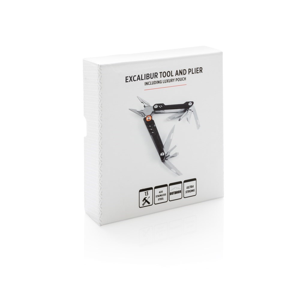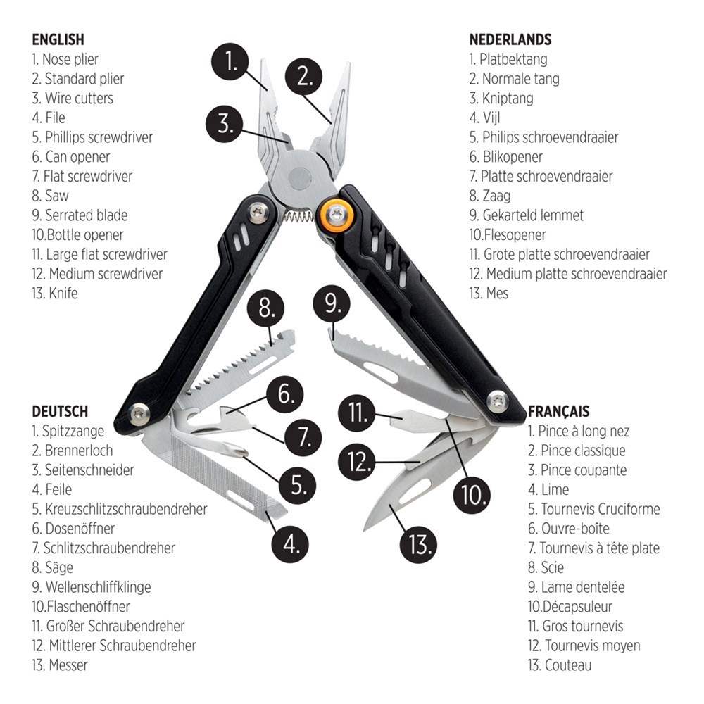 Massives Tool mit 13 Funktionen. Im 1680D Etui sowie Geschenkbox verpackt. Aluminiumgehäuse, die Tools aus Edelstahl. Zange, Messer, Dosenöffner, verschiedene Schraubendreher uvm.