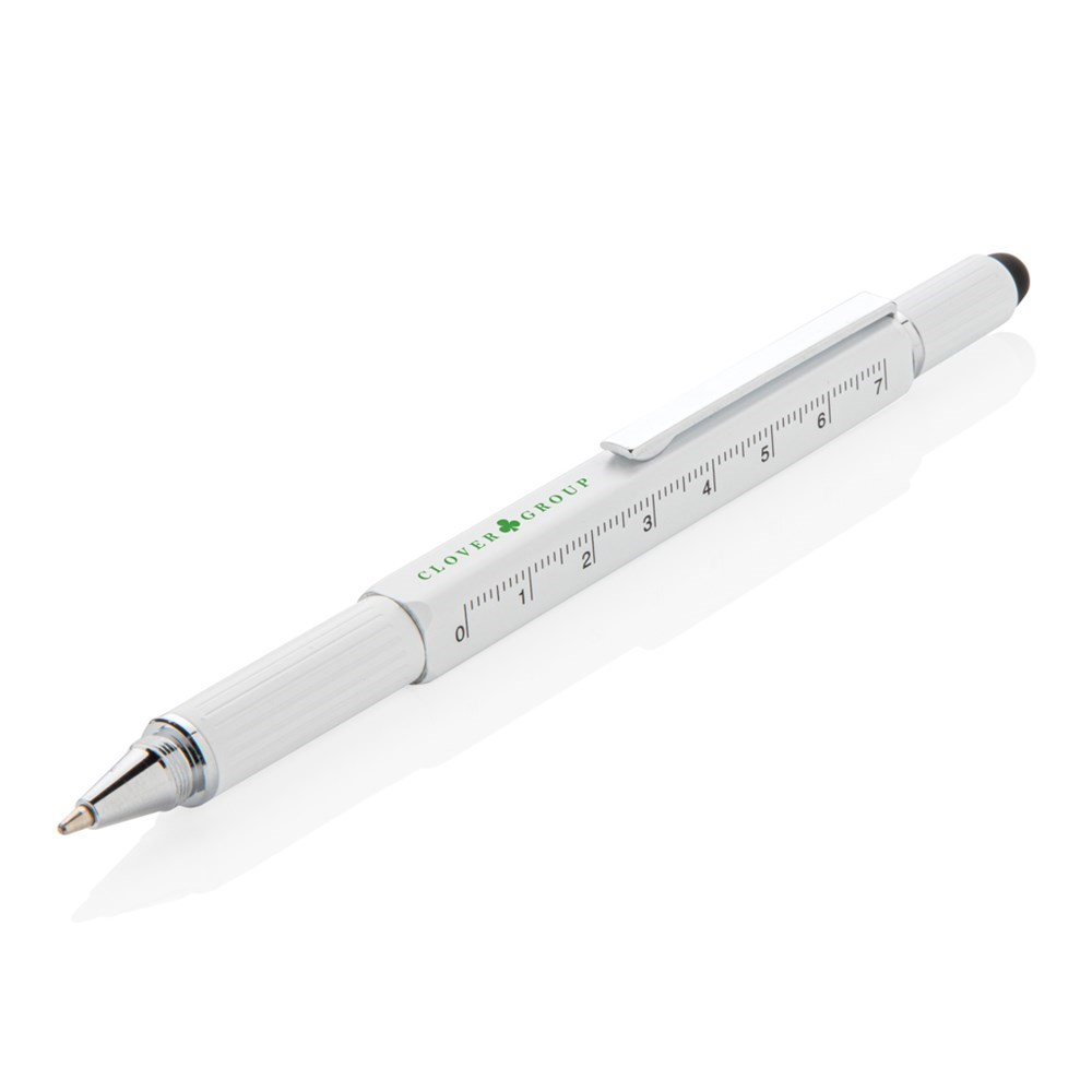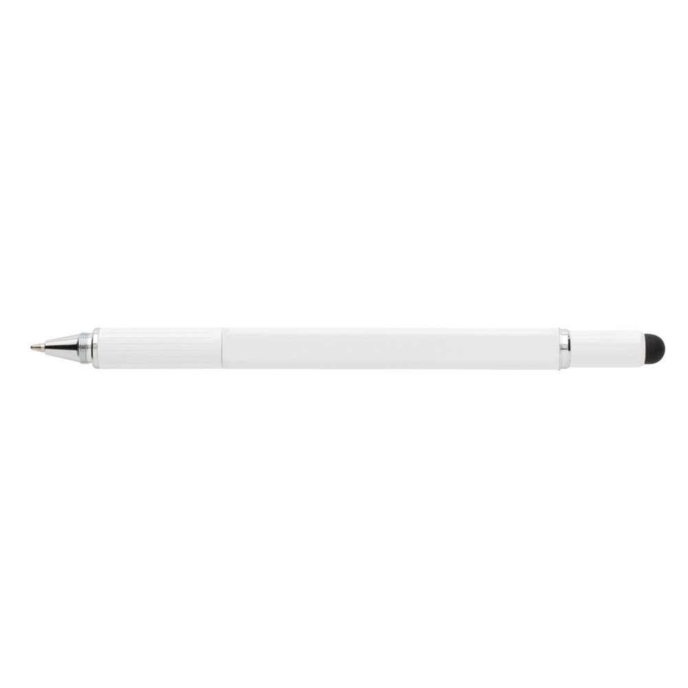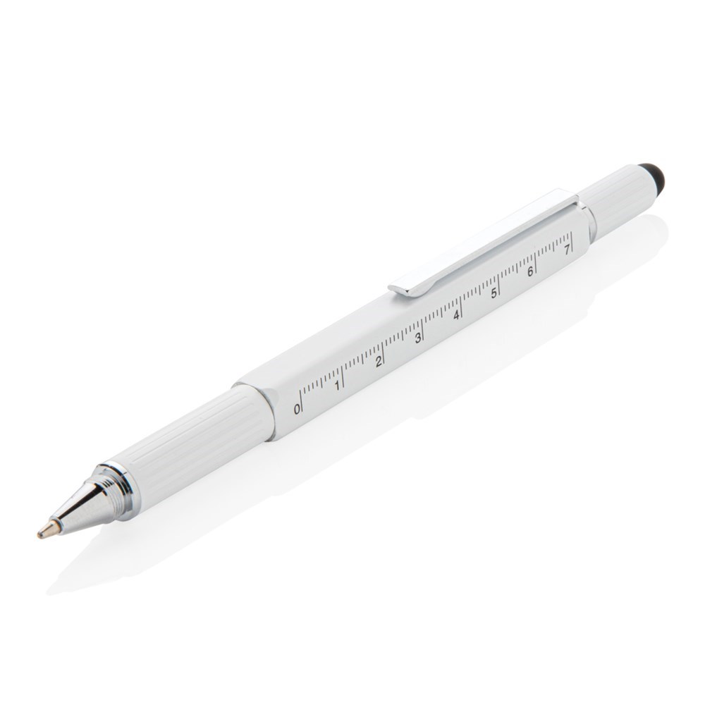 Multifunktionsstift - 400m blauschreibend - mit Skalierung ( 7cm), Wasserwaage, Schraubendreher, Stylus-Spitze. Aus Messing mit Aluminiumclip.