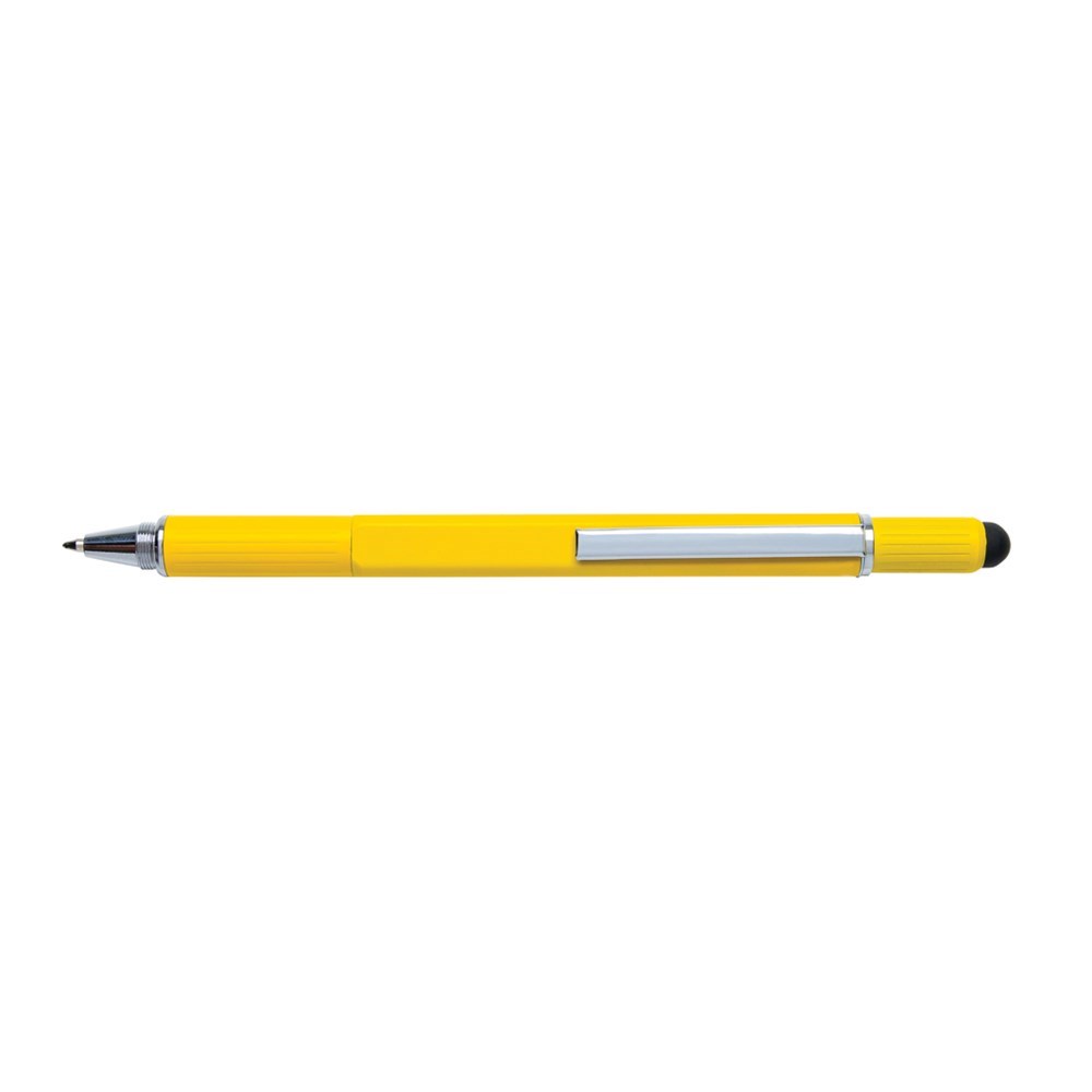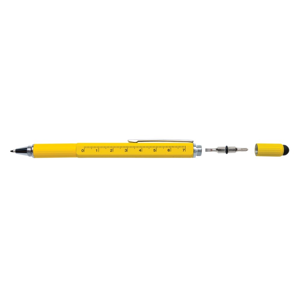 Multifunktionsstift - 400m blauschreibend - mit Skalierung ( 7cm), Wasserwaage, Schraubendreher, Stylus-Spitze. Aus Messing mit Aluminiumclip.