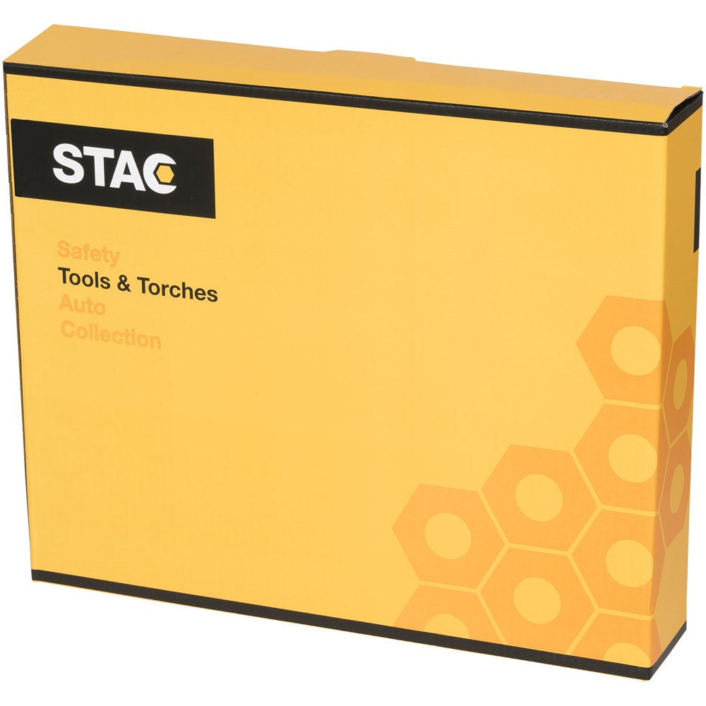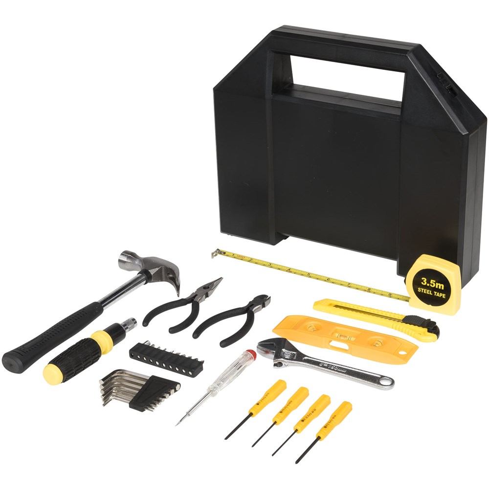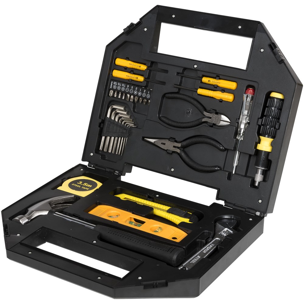 Der Werkzeugkoffer kommt mit Klick-Mechanismus-Schlössern und einem faltbaren Tragegriff und enthält einen Klauenhammer, einen 4 mm flachen Schraubenzieher, eine Kombizange, ein Cutter-Messer mit einer Sperrfunktion, einen Inbusschlüsselhalter mit 5 Inbusschlüsseln (2 - 6 mm) mit Standard- und Kugelenden. 3-m-Maßband mit einem Sperrsystem, Schraubenzieher mit Spannungsprüfer, Isolierband und 4 Präzisions-Schraubenzieher.