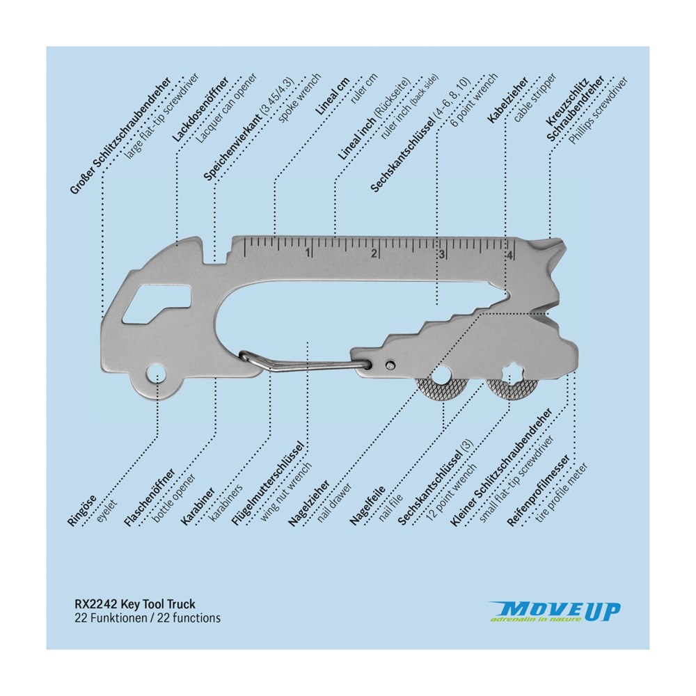 Überraschen Sie Ihre Handwerker mit Multifunktionstools als Schlüsselanhänger: ein ideales Geschenk nicht nur zum Geburtstag oder zu Weihnachten und nicht nur für Männer. Mit den kleinen Begleitern von ROMINOX® haben Sie die praktischsten Werkzeuge wie Schraubenzieher, Lineal oder Sechskantschlüssel immer dabei, egal ob im Alltag, im Büro oder auf Reisen. Das Key Tool Truck / LKW mit 22 Funktionen kommt in einem "Danke"-Mäppchen inkl. Funktionsbeschreibung. "An die Werkzeuge, fertig, los"! Finden Sie die perfekte Kombination aus Ihrem Lieblings Keytool und Motiv-Mäppchen. Auf Wunsch auch mit Gravur und/oder im Mäppchen im Eigendesign erhältlich.