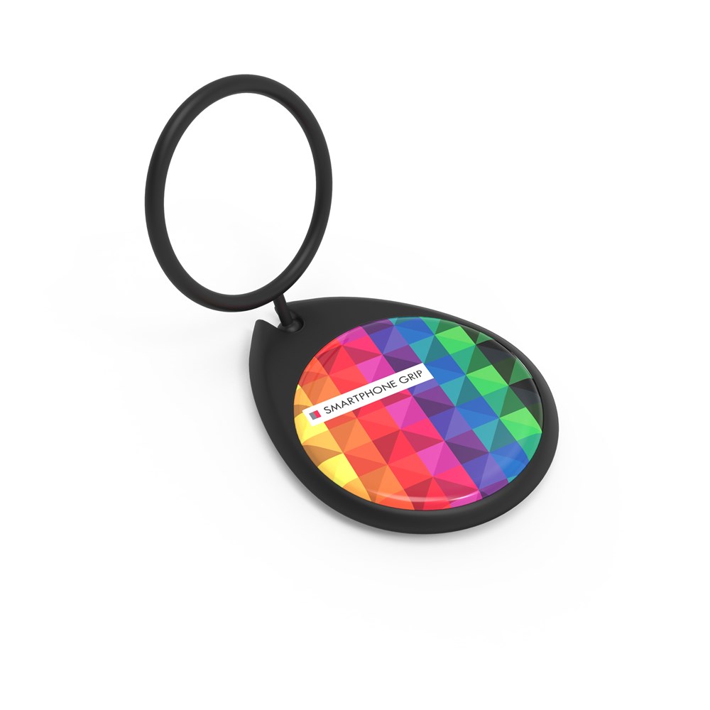 Der Smartphone Grip kann an einem Telefon befestigt werden, damit dieses besser gehalten werden kann. Die Veredelung erfolgt durch ein Vollfarb-Doming.