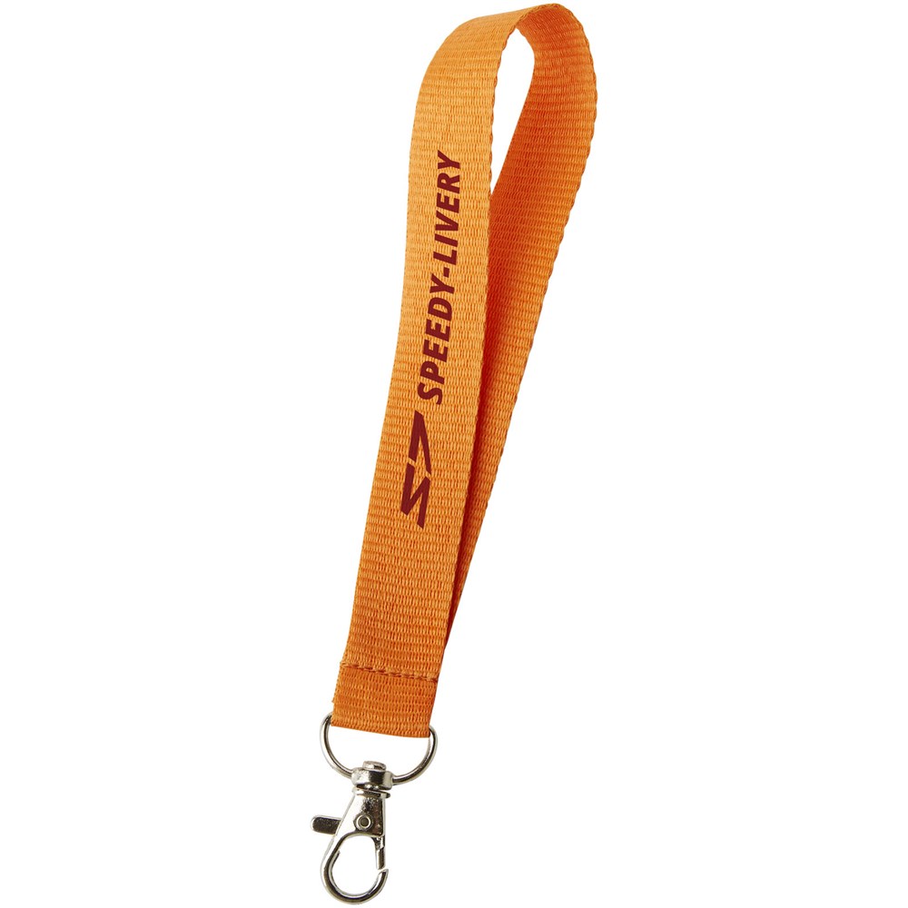 Mini-Lanyard, das einen Metallhaken für das Aufnehmen eines Namensschilds, eines Ausweises oder von Schlüsseln enthält.