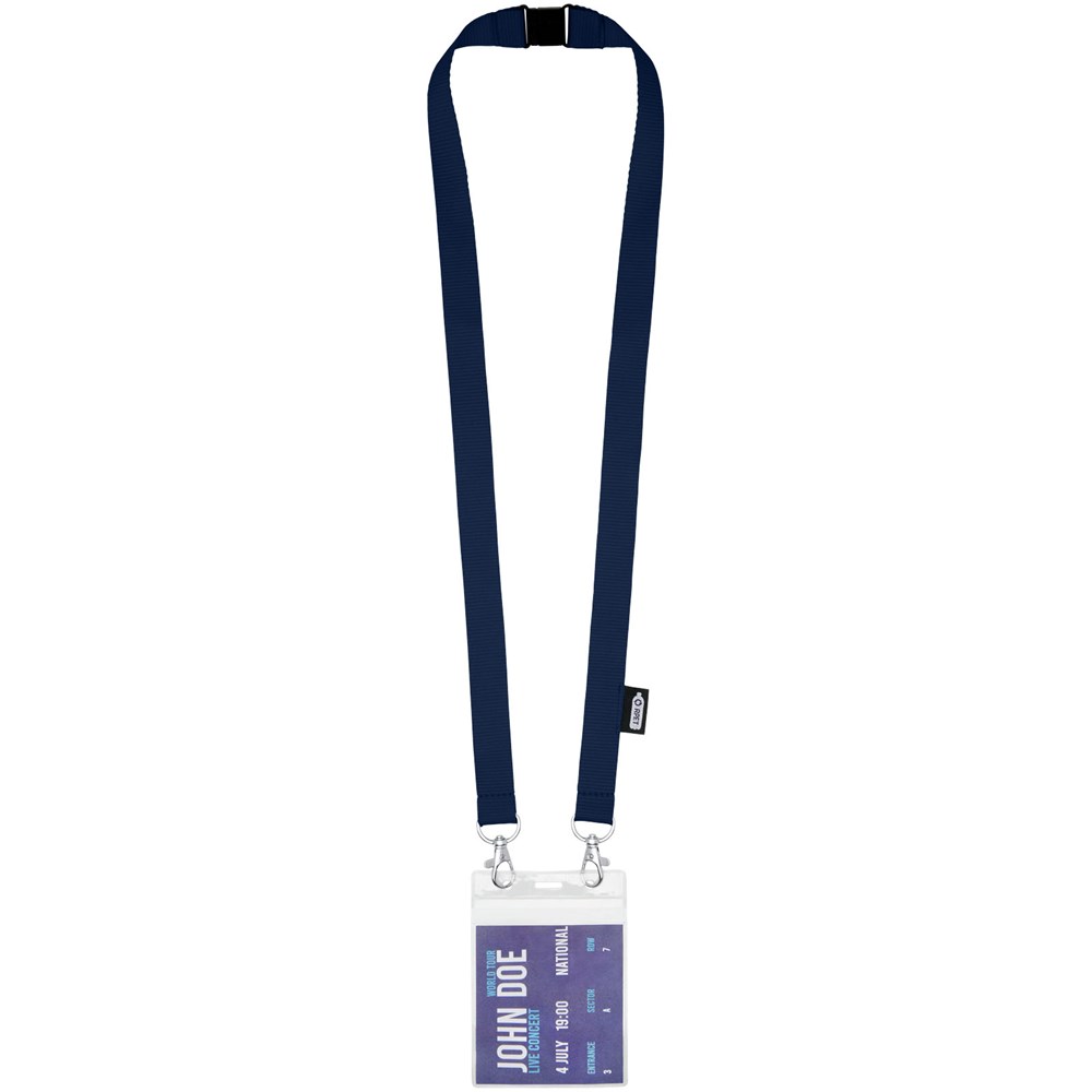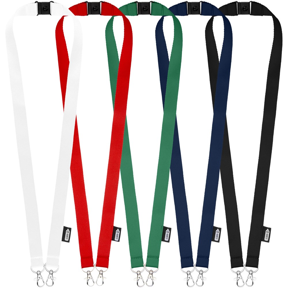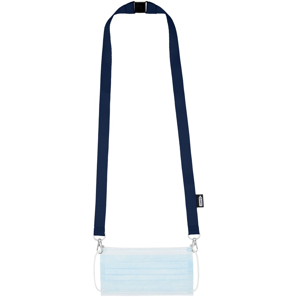 Schlüsselband aus recyceltem PET Kunststoff mit Abreißverschluss zur Befestigen einer Gesichtsmaske und eines Ausweishalters. Wird mit zwei hochwertigen ovalen Haken mit Karabinerhaken geliefert. Besonders geeignet für breite Kartenhalter. Eine nachhaltiges Produkt mit einem hervorragenden Preis-Leistungs-Verhältnis und großer Logofläche.