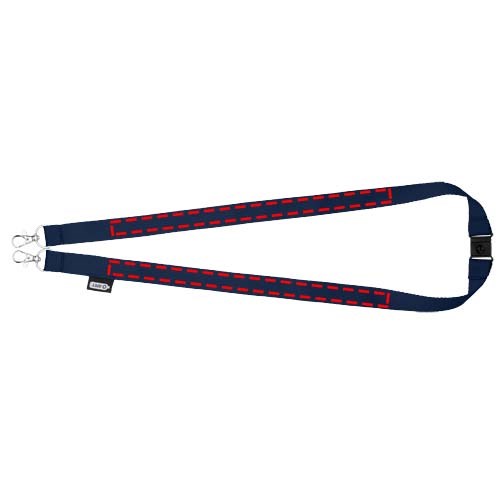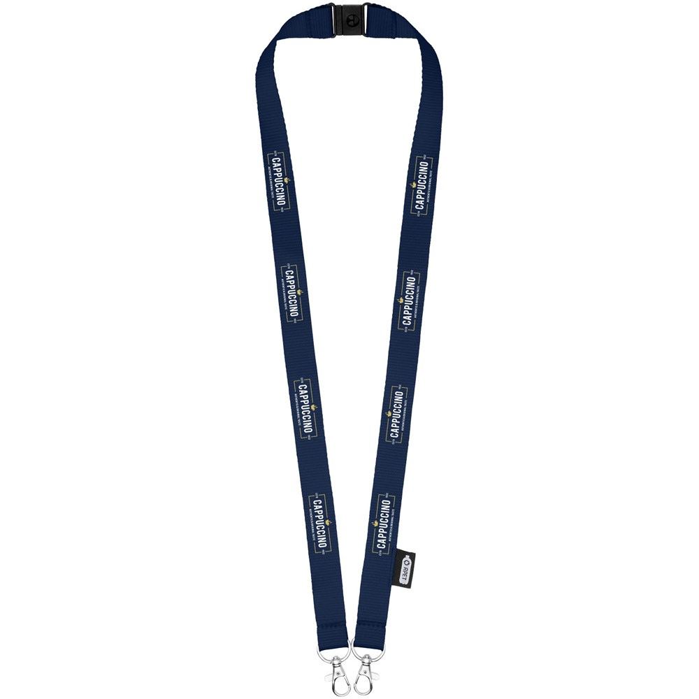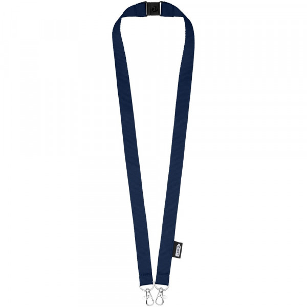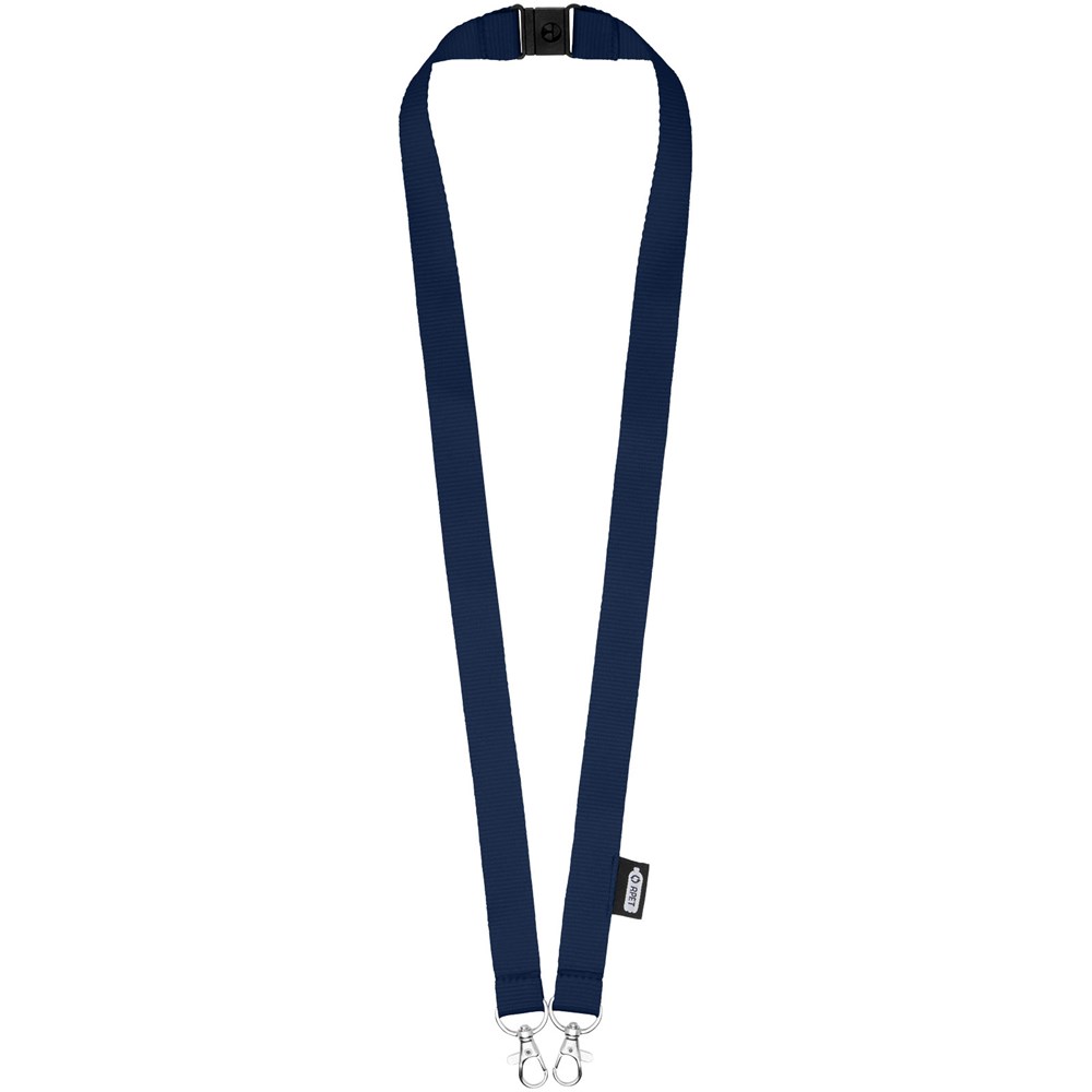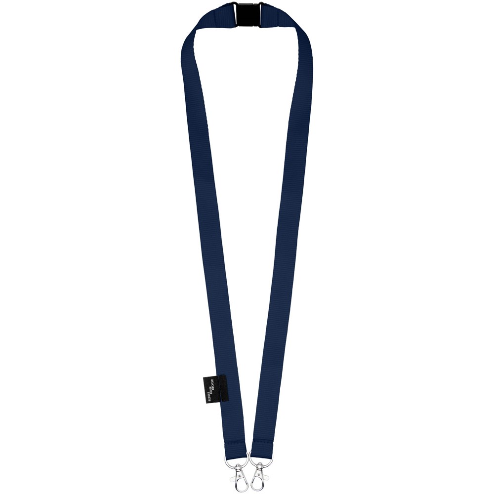 Schlüsselband aus recyceltem PET Kunststoff mit Abreißverschluss zur Befestigen einer Gesichtsmaske und eines Ausweishalters. Wird mit zwei hochwertigen ovalen Haken mit Karabinerhaken geliefert. Besonders geeignet für breite Kartenhalter. Eine nachhaltiges Produkt mit einem hervorragenden Preis-Leistungs-Verhältnis und großer Logofläche.