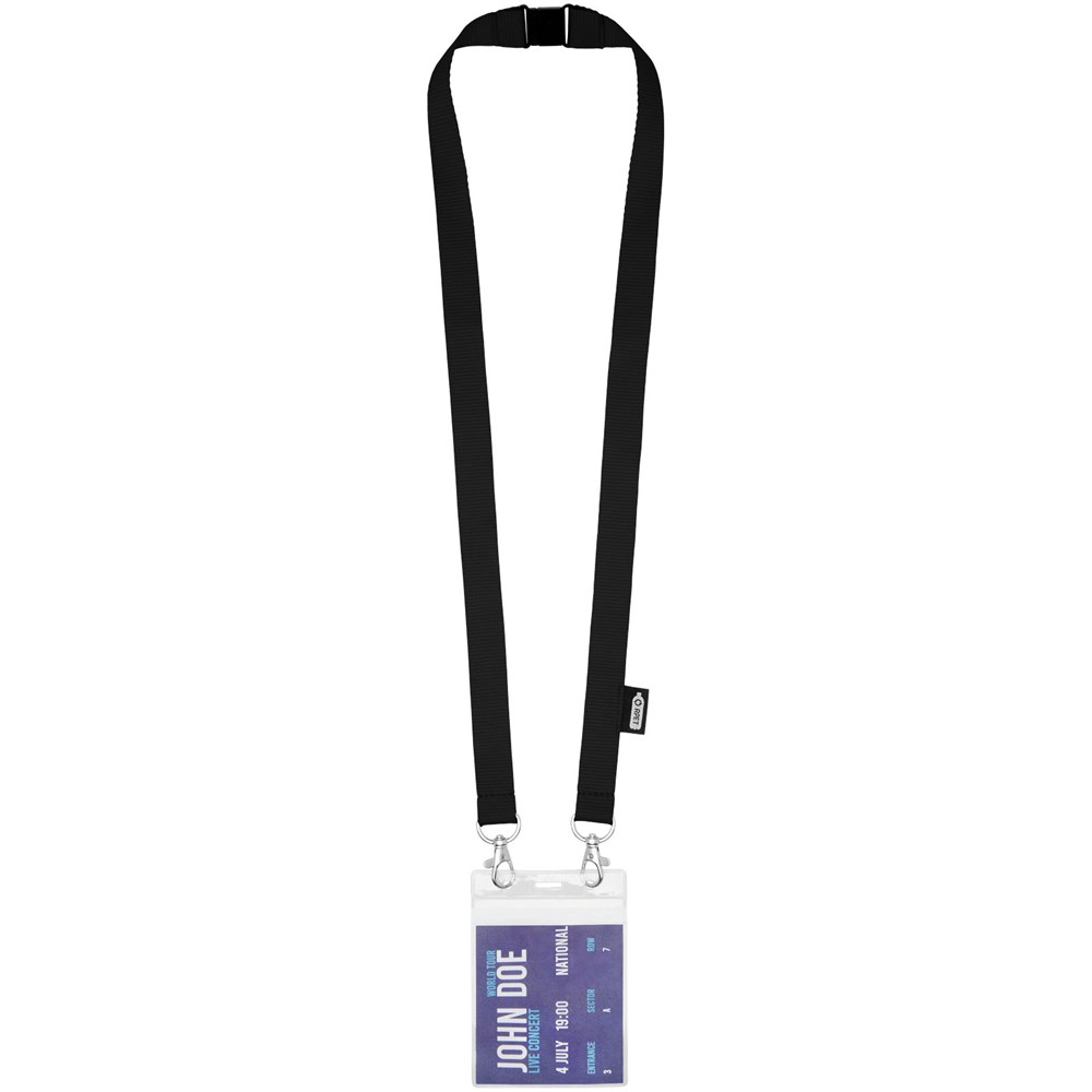 Schlüsselband aus recyceltem PET Kunststoff mit Abreißverschluss zur Befestigen einer Gesichtsmaske und eines Ausweishalters. Wird mit zwei hochwertigen ovalen Haken mit Karabinerhaken geliefert. Besonders geeignet für breite Kartenhalter. Eine nachhaltiges Produkt mit einem hervorragenden Preis-Leistungs-Verhältnis und großer Logofläche.