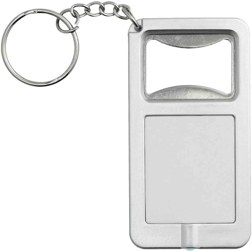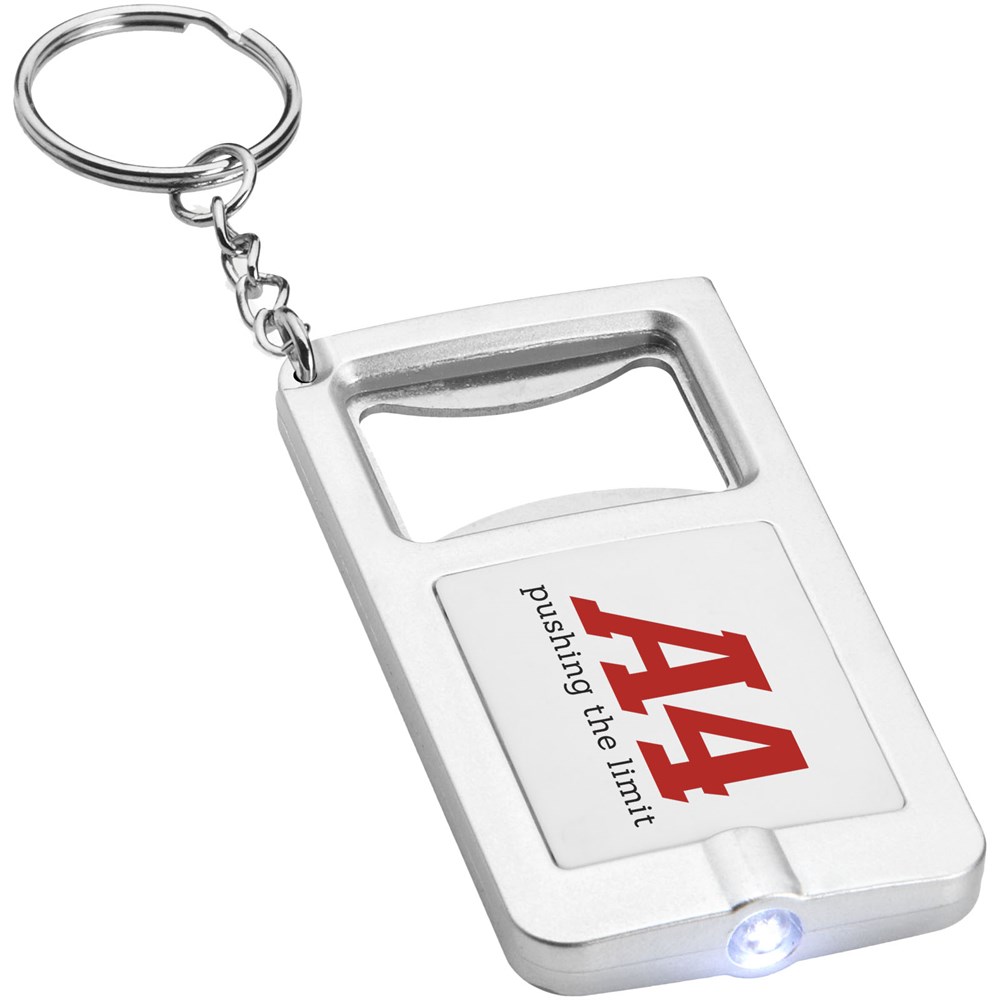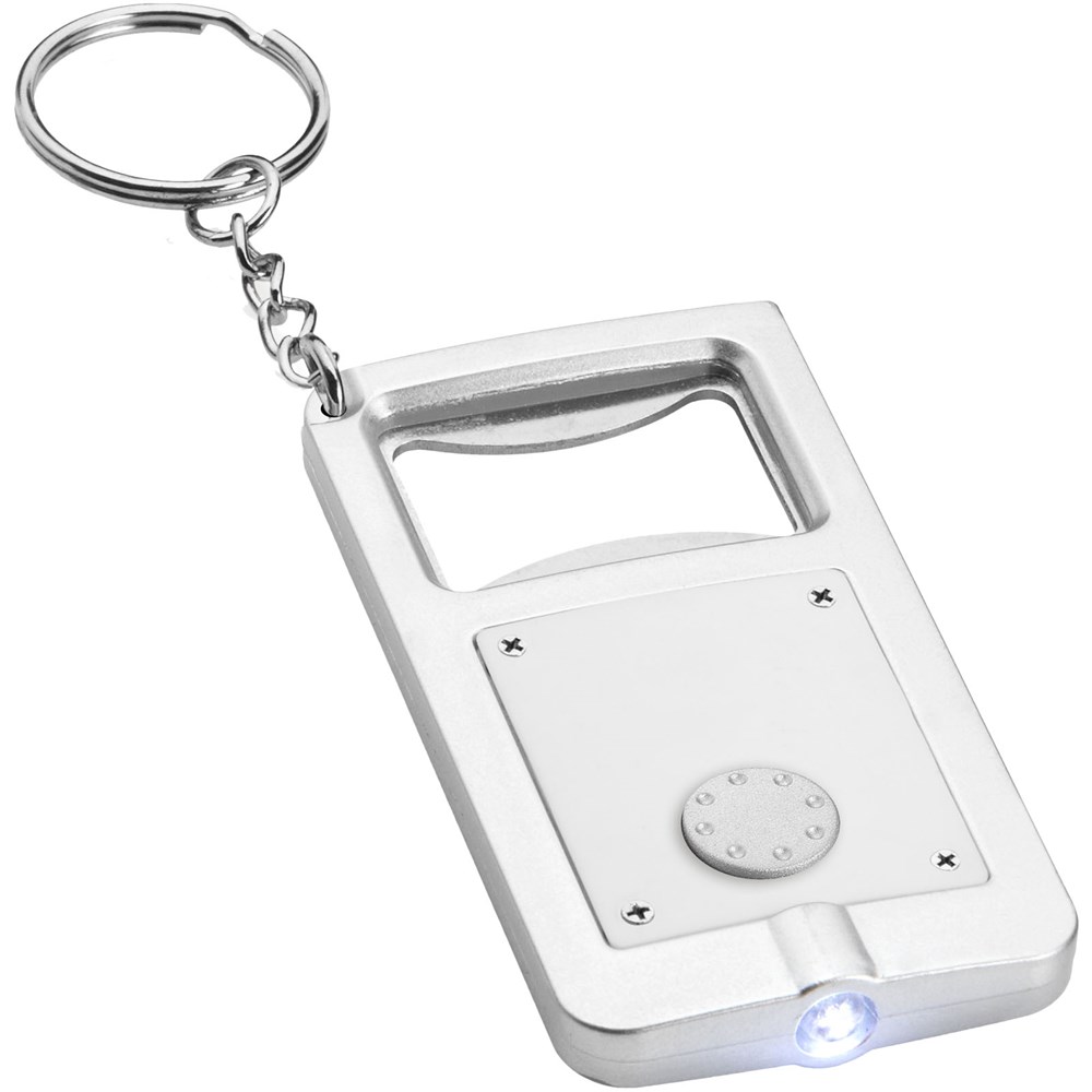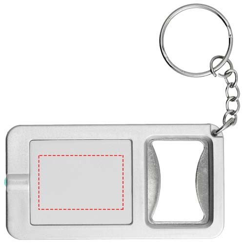 Lampe mit einer weißen LED. Flaschenöffner aus Metall. Geteilter Schlüsselring aus Metall. Ein/Aus-Taste auf der Rückseite. Inkl. Batterien.