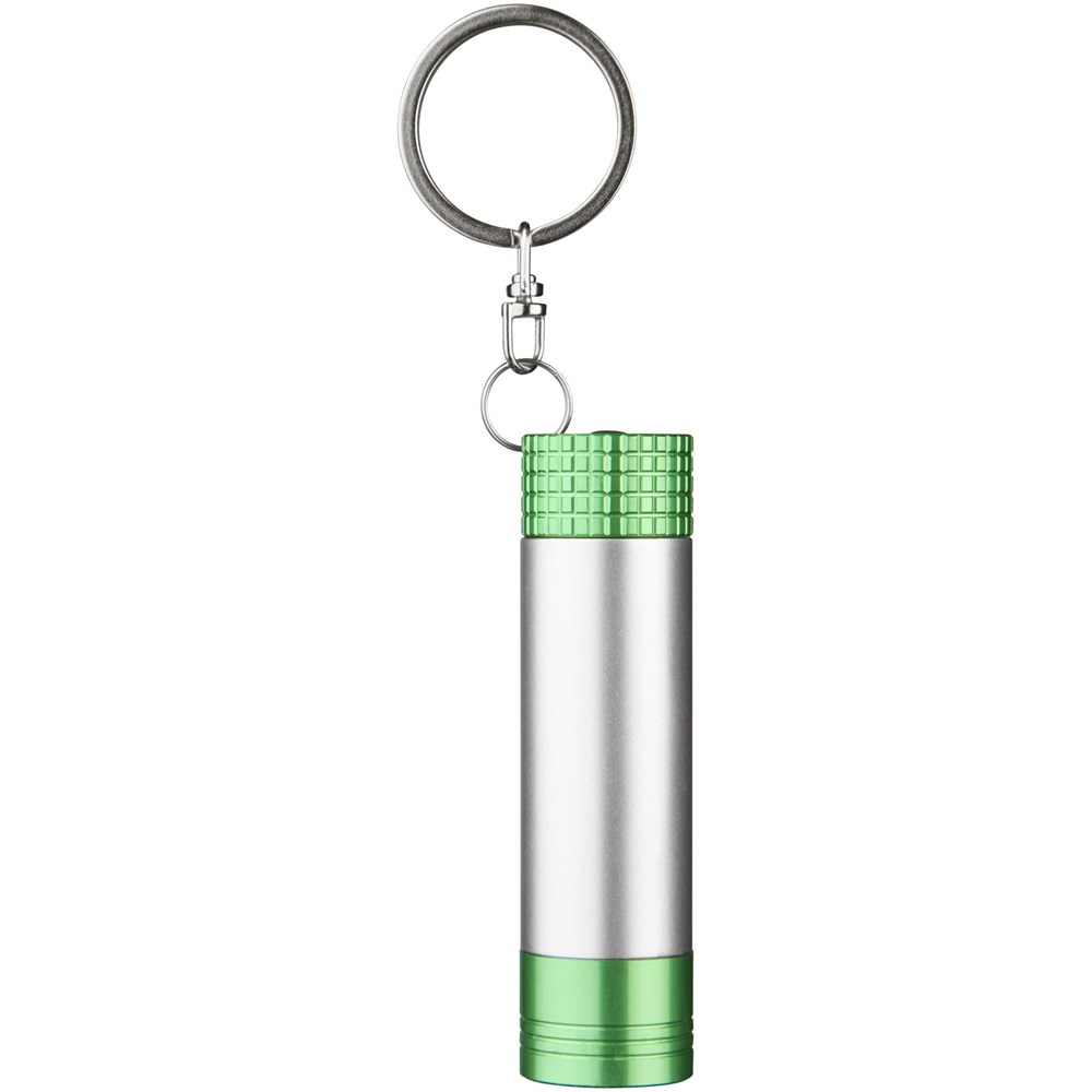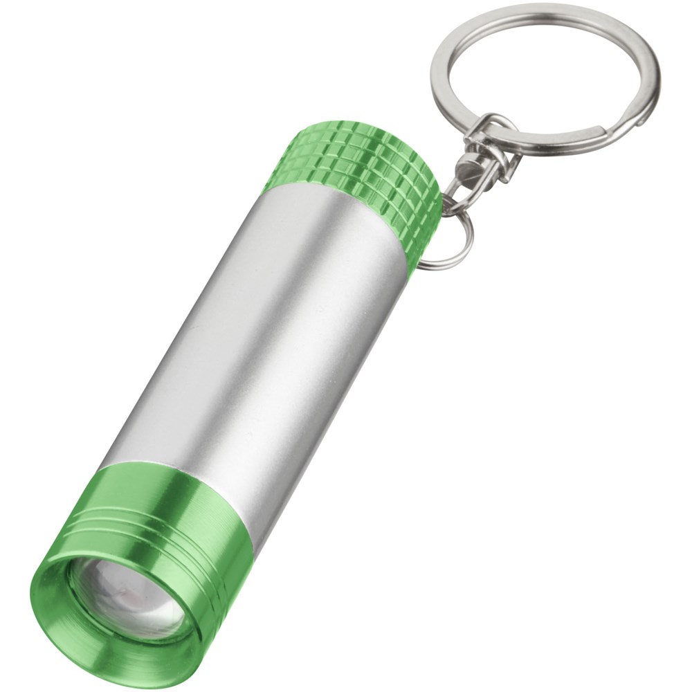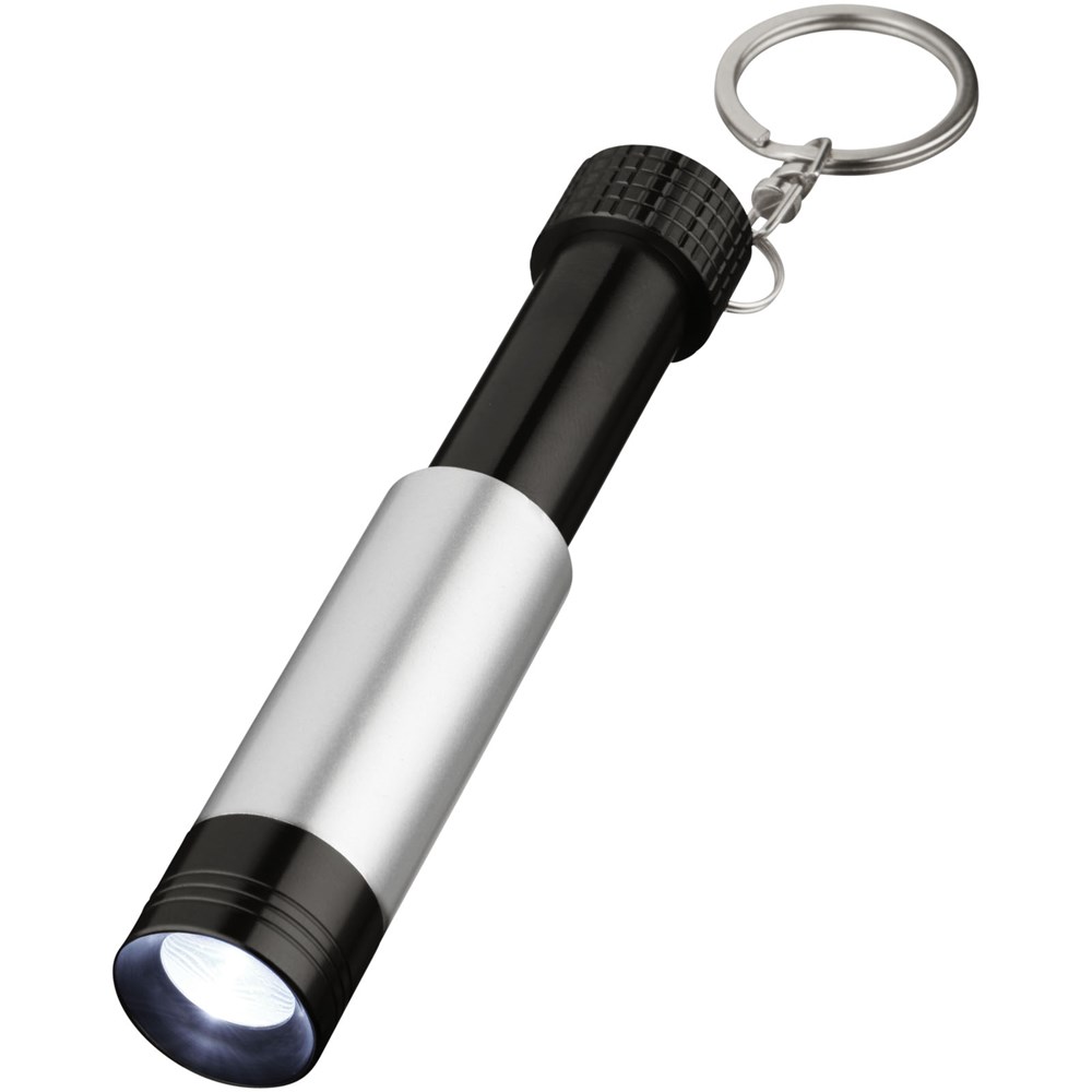 Einzelne weiße LED-Leuchte mit Druckknopfschalter auf der Rückseite. Ideal zum Gravieren, da Ihr Logo beim Herausziehen der Fassung zu sehen ist. Schlüsselring aus Metall. Batterien enthalten.