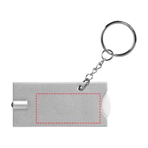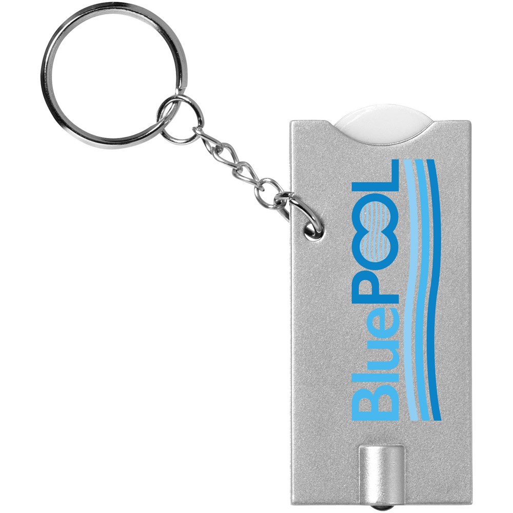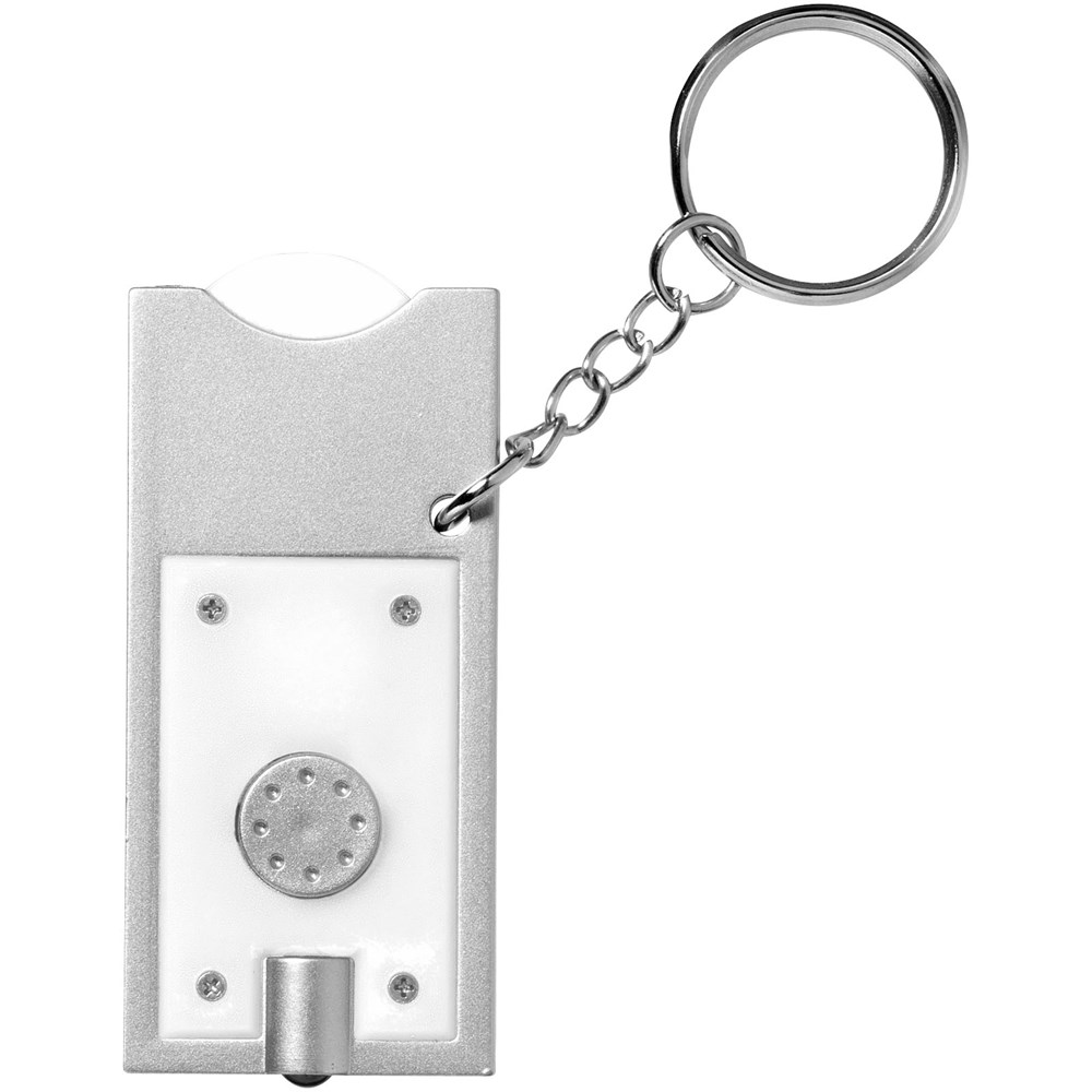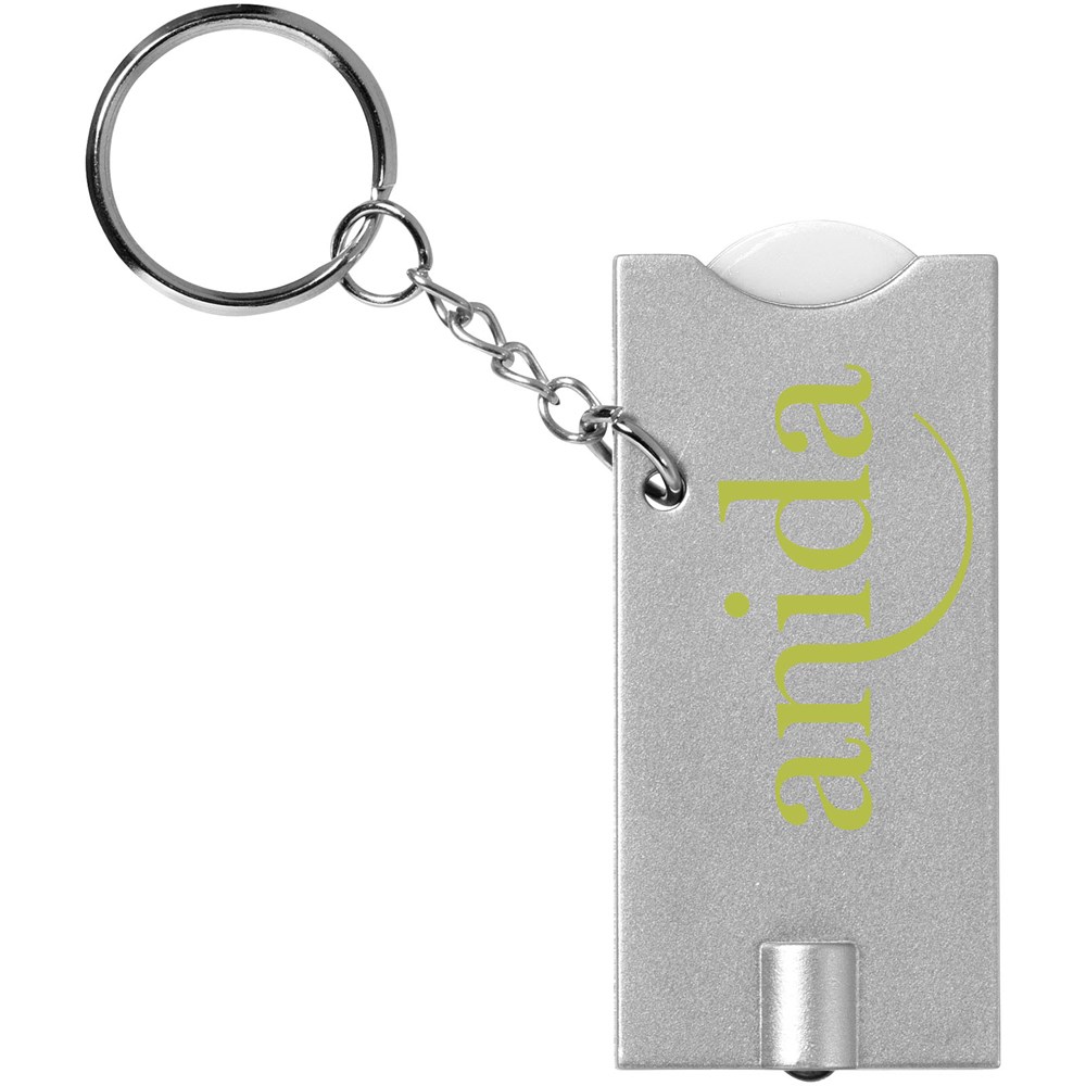 1 Euro große Plastikmünze mit 6 mm Loch und Halter und einem weißen LED Schlüssellicht. Geteilter Schlüsselring aus Metall mit einem Durchmesser von 25 mm. Batterien mitgeliefert und eingelegt.