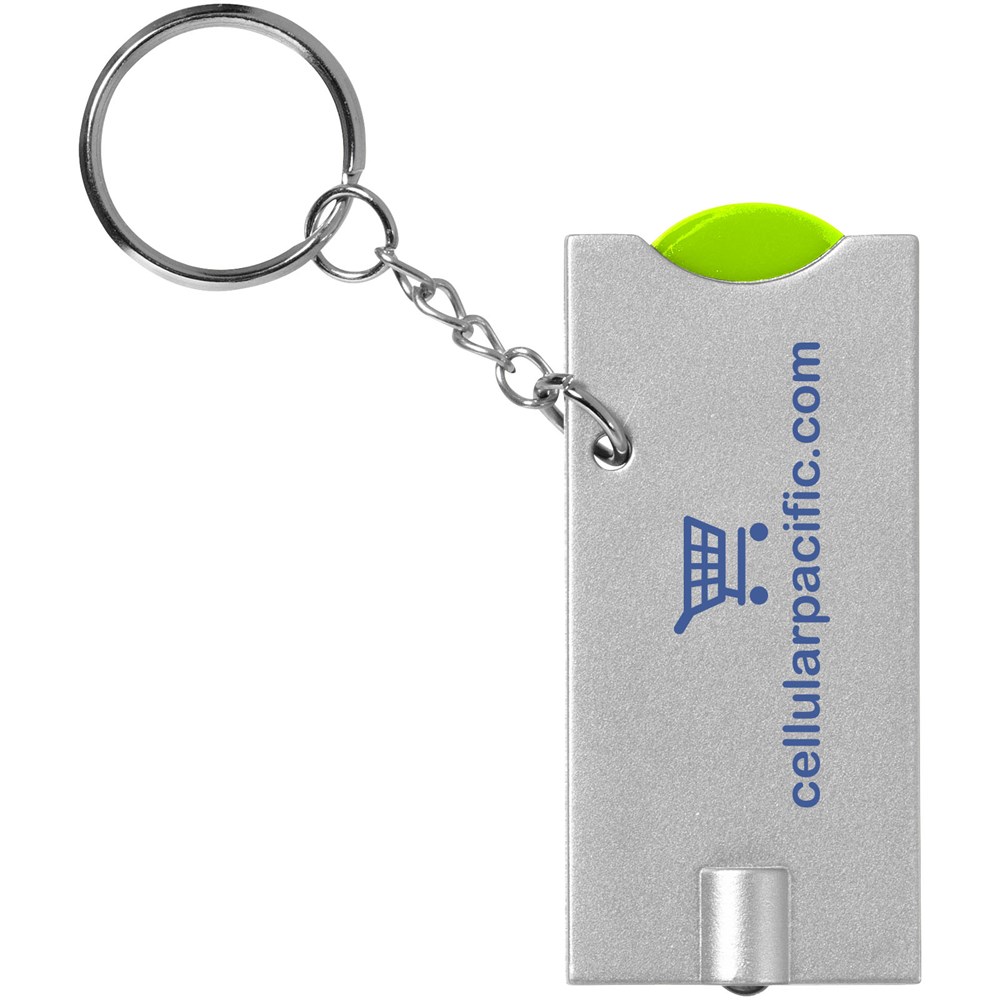 1 Euro große Plastikmünze mit 6 mm Loch und Halter und einem weißen LED Schlüssellicht. Geteilter Schlüsselring aus Metall mit einem Durchmesser von 25 mm. Batterien mitgeliefert und eingelegt.