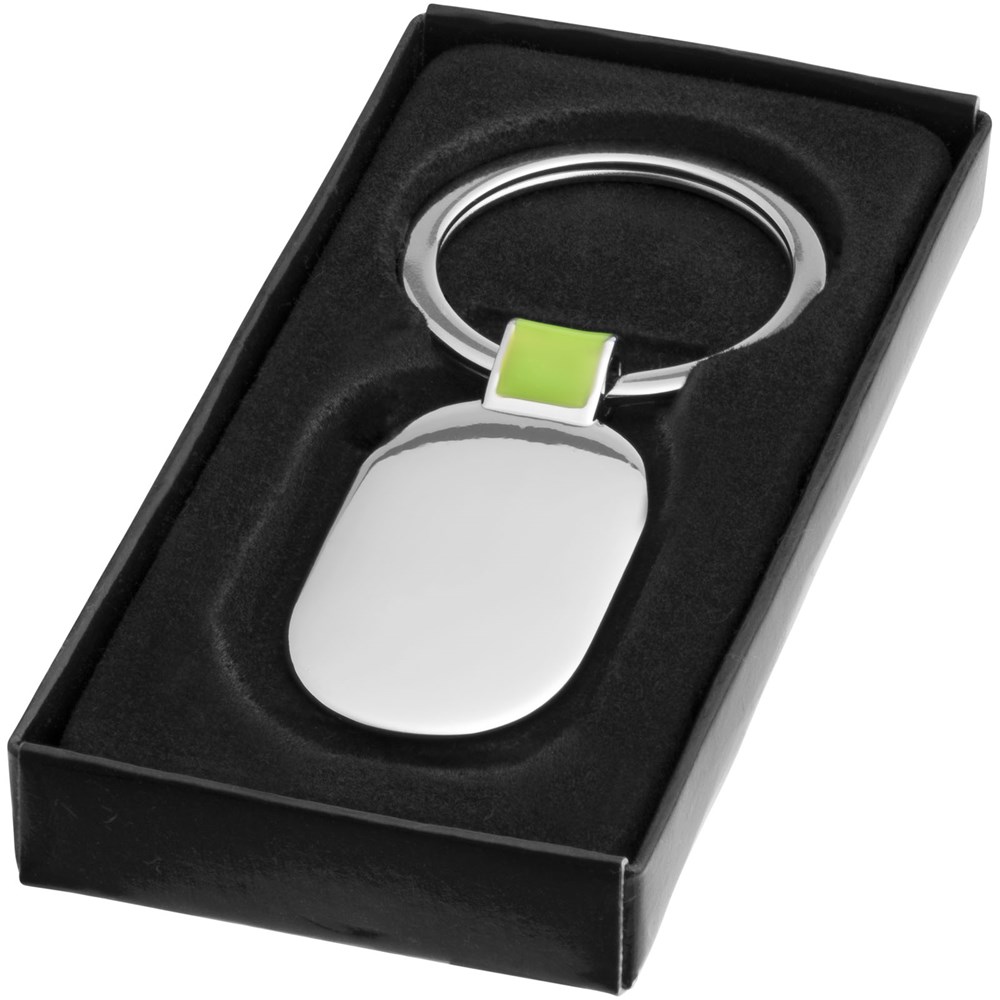 Klassischer Schlüsselanhänger mit farbigem Akzent. Inkl. schwarzer Geschenkverpackung.