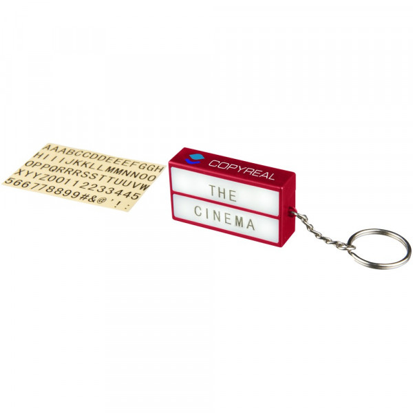 Cinema LED-Schlüssellicht. LED Schlüssellicht erinnert an Retro Kinoschrift. Enthält Aufkleber mit 75 Buchstaben, Zahlen und Zeichen, um Wörter und Sprüche zu erstellen. Schlüsselring und Batterien. ABS Kunststoff.