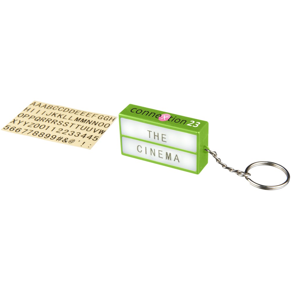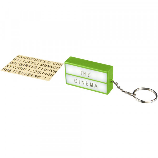 Cinema LED-Schlüssellicht. LED Schlüssellicht erinnert an Retro Kinoschrift. Enthält Aufkleber mit 75 Buchstaben, Zahlen und Zeichen, um Wörter und Sprüche zu erstellen. Schlüsselring und Batterien. ABS Kunststoff.