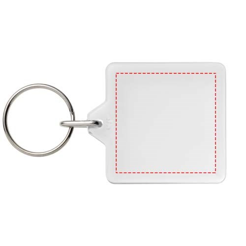 Transparenter, quadratischer U1-Schlüsselanhänger mit metallenem Schlüsselring. Der Metallring bietet ein flaches Profil, das sich ideal für Mailings eignet. Abmessungen der Druckeinlage: 3,2 cm x 3,2 cm.