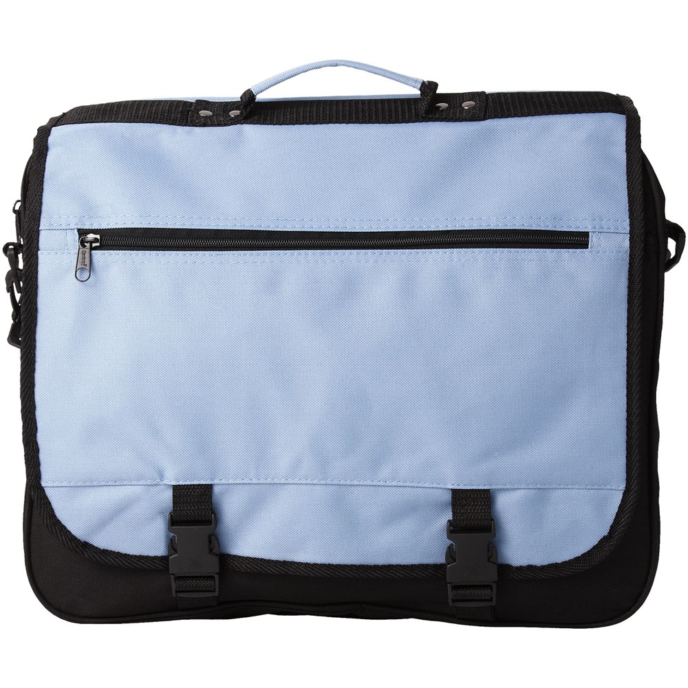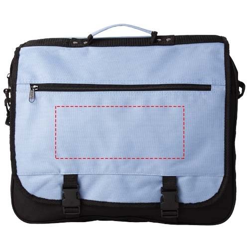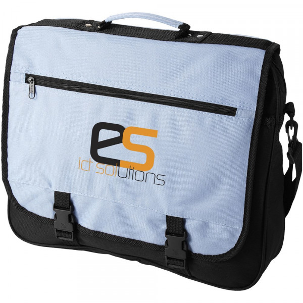 Messetasche mit einstellbarem Schulterriemen, Klappe mit Schnallenverschluss, Reißverschlussfach in der Klappe, Hauptfach mit Reißverschluss und mehreren offenen Fächern unter der Klappe.