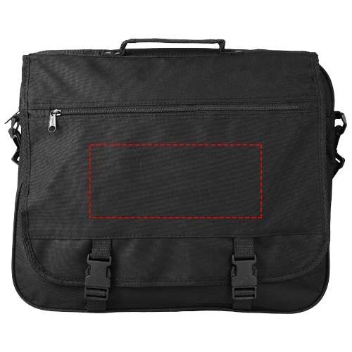 Messetasche mit einstellbarem Schulterriemen, Klappe mit Schnallenverschluss, Reißverschlussfach in der Klappe, Hauptfach mit Reißverschluss und mehreren offenen Fächern unter der Klappe.