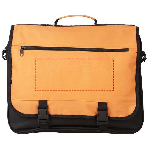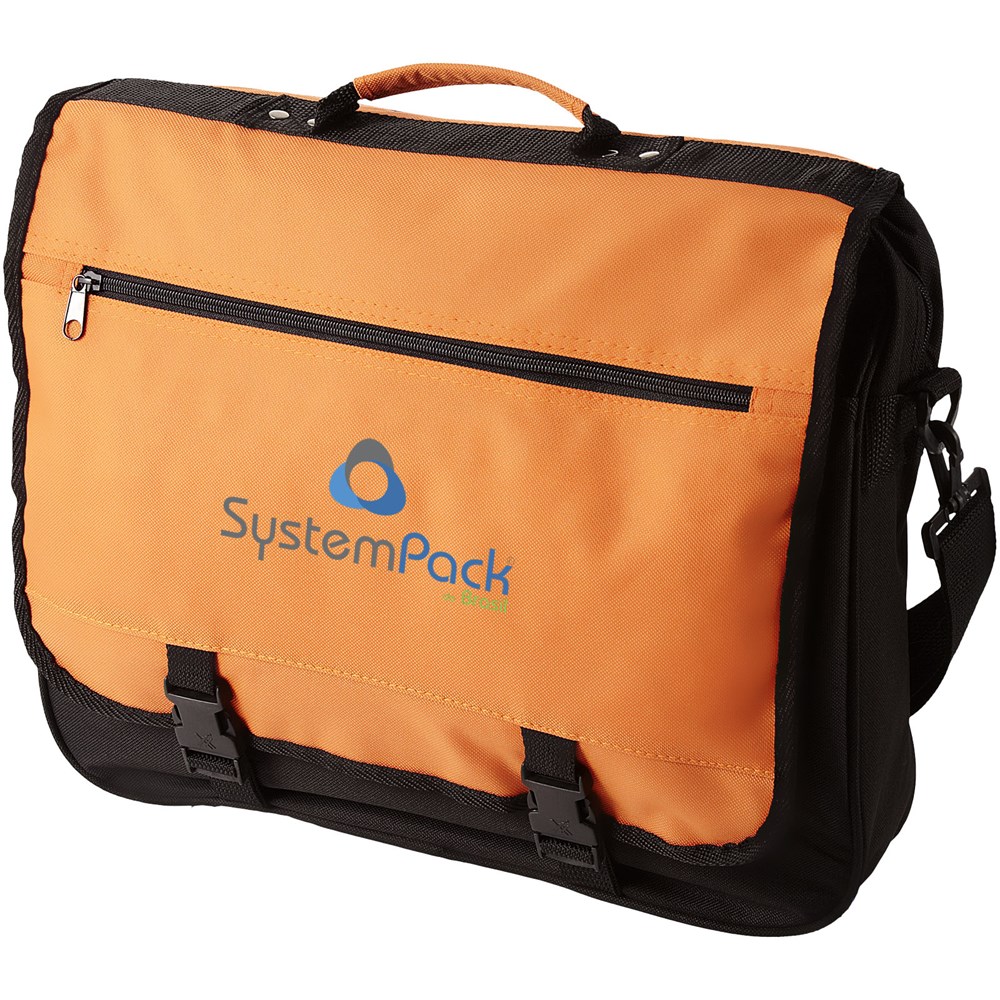 Messetasche mit einstellbarem Schulterriemen, Klappe mit Schnallenverschluss, Reißverschlussfach in der Klappe, Hauptfach mit Reißverschluss und mehreren offenen Fächern unter der Klappe.
